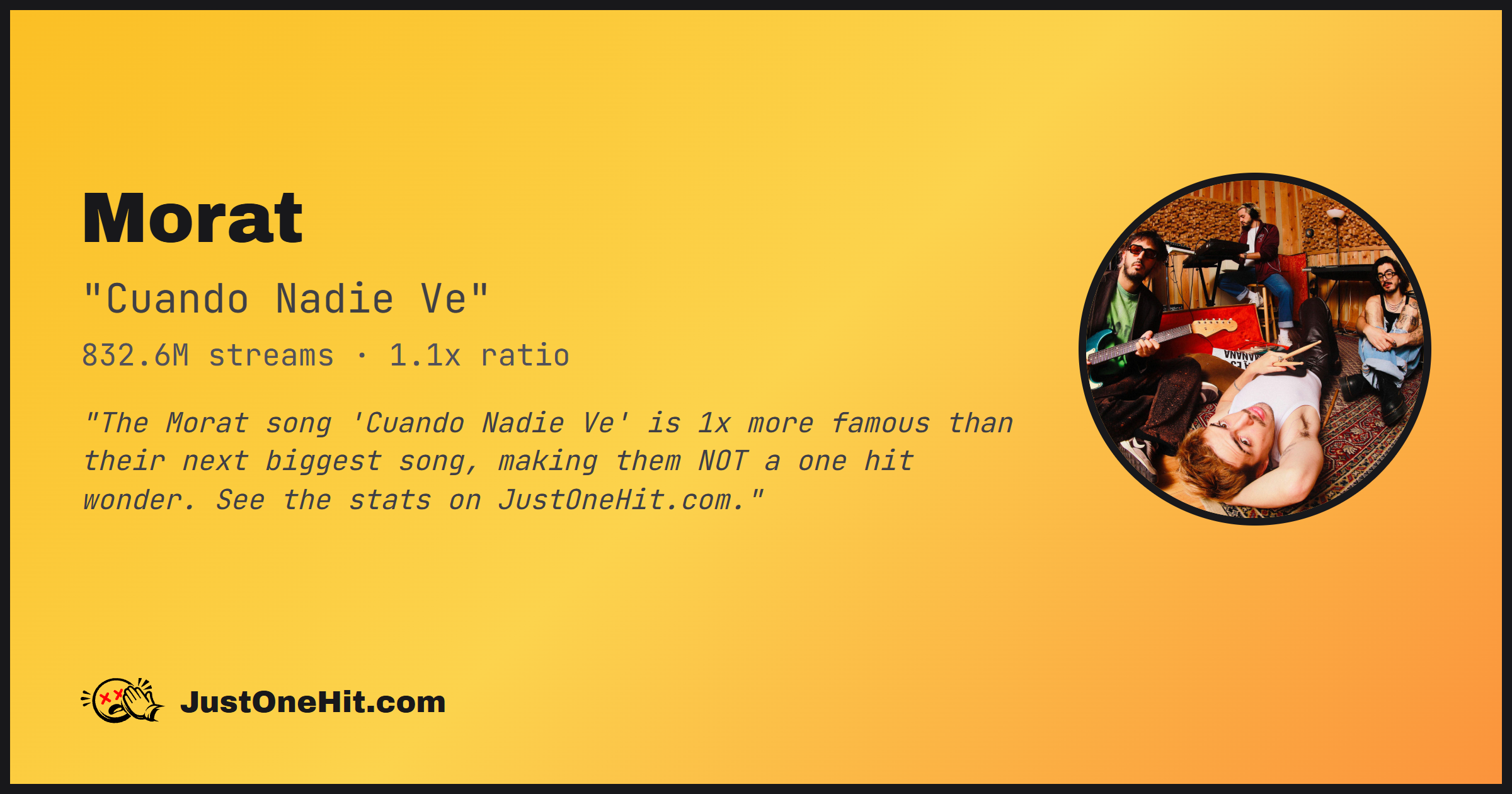 "The Morat song 'Cuando Nadie Ve' is 1x more famous than their next biggest song, making them NOT a one hit wonder. See the stats on JustOneHit.com."