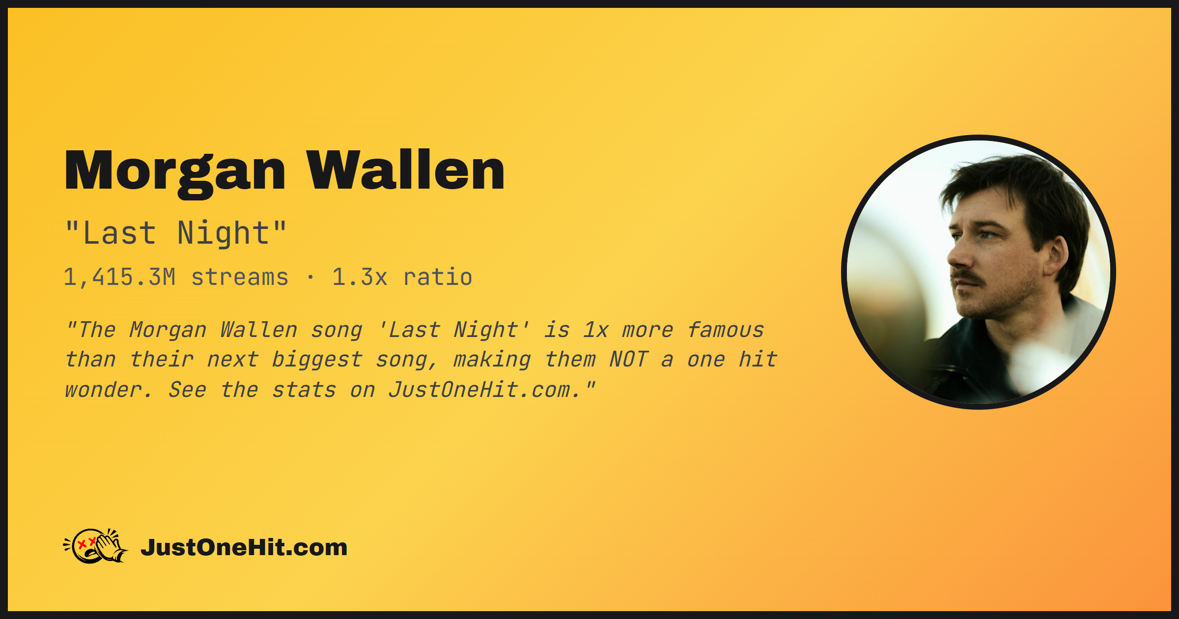 "The Morgan Wallen song 'Last Night' is 1x more famous than their next biggest song, making them NOT a one hit wonder. See the stats on JustOneHit.com."