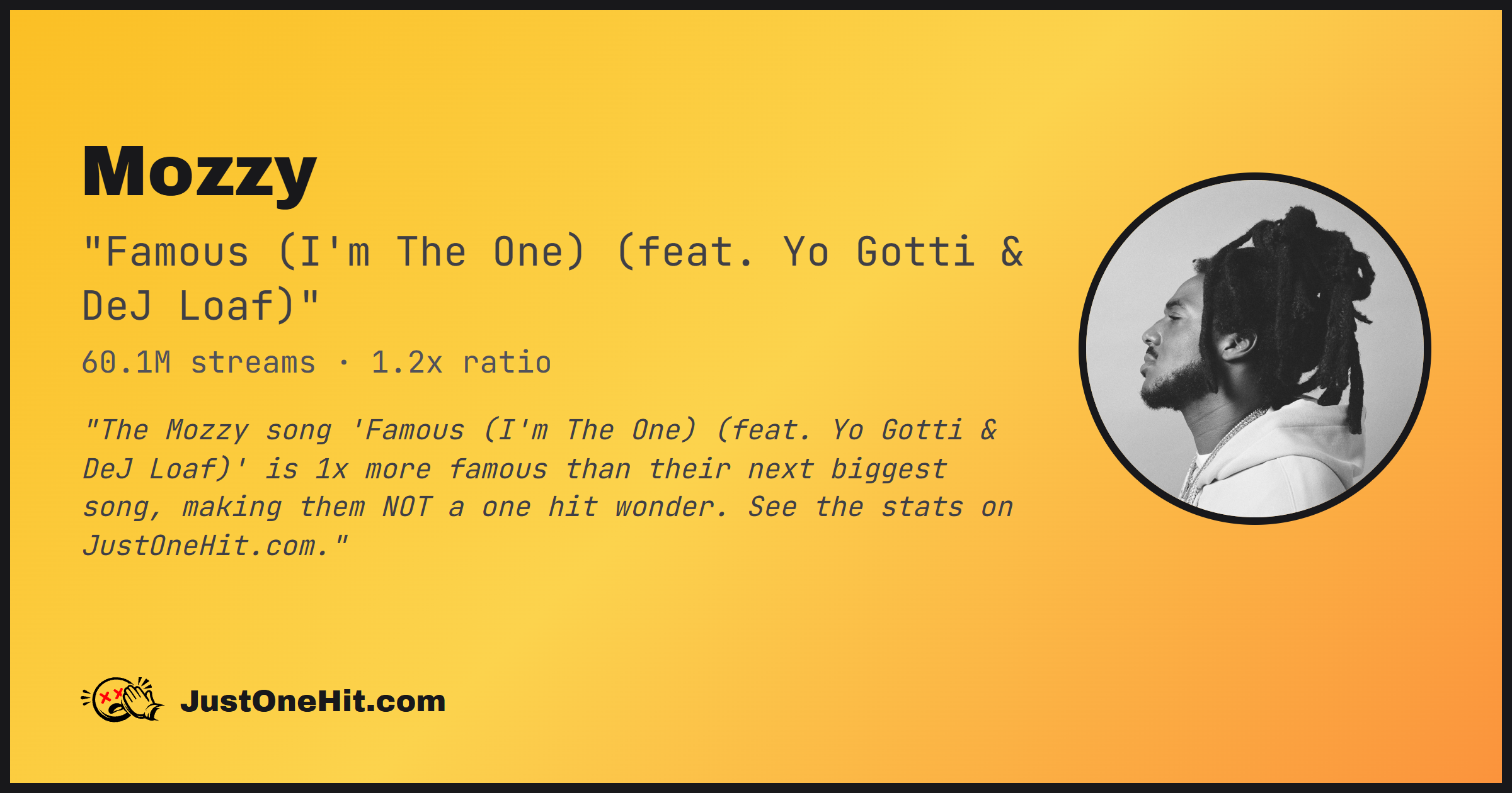 "The Mozzy song 'Famous (I'm The One) (feat. Yo Gotti & DeJ Loaf)' is 1x more famous than their next biggest song, making them NOT a one hit wonder. See the stats on JustOneHit.com."