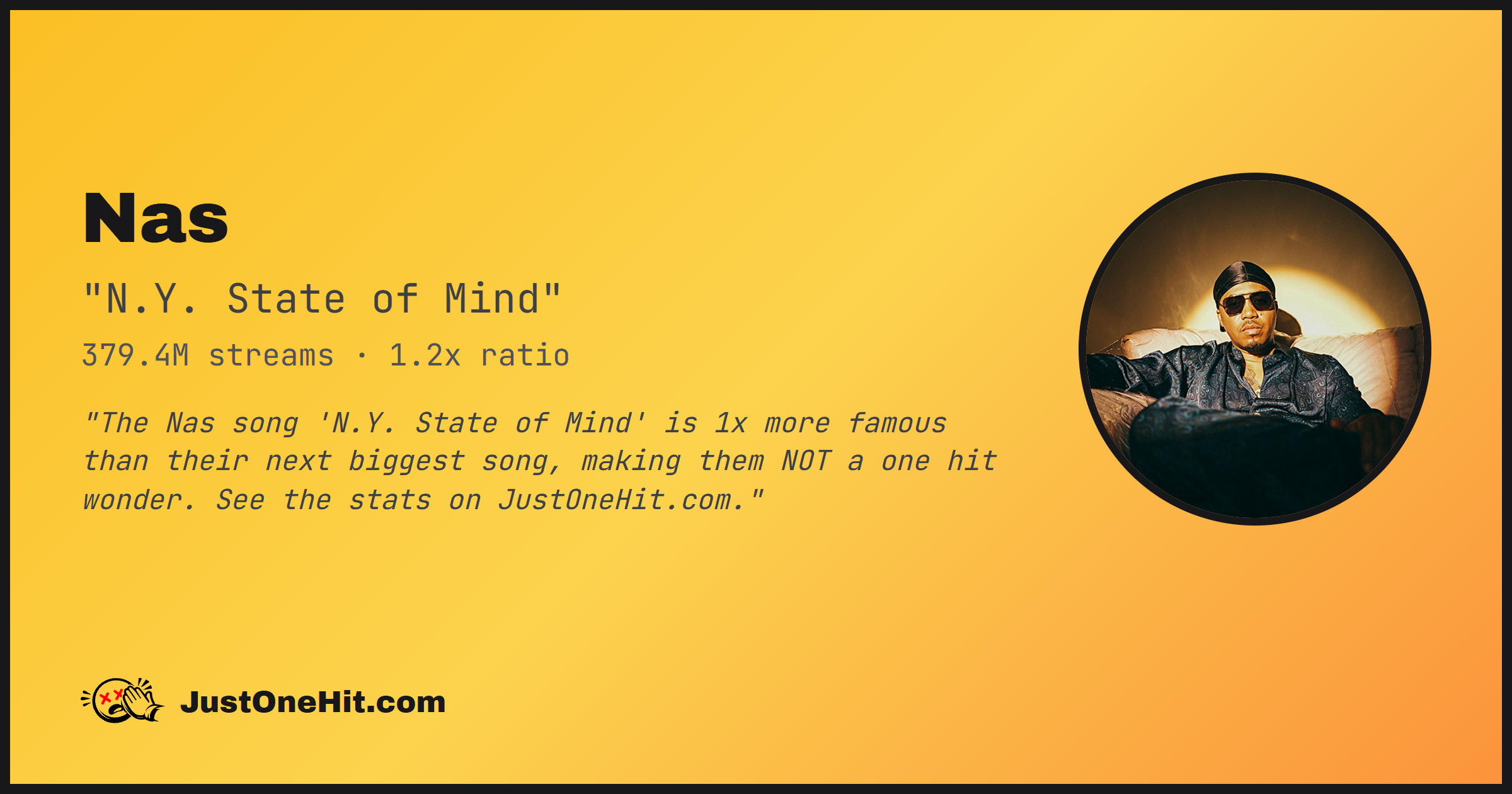 "The Nas song 'N.Y. State of Mind' is 1x more famous than their next biggest song, making them NOT a one hit wonder. See the stats on JustOneHit.com."