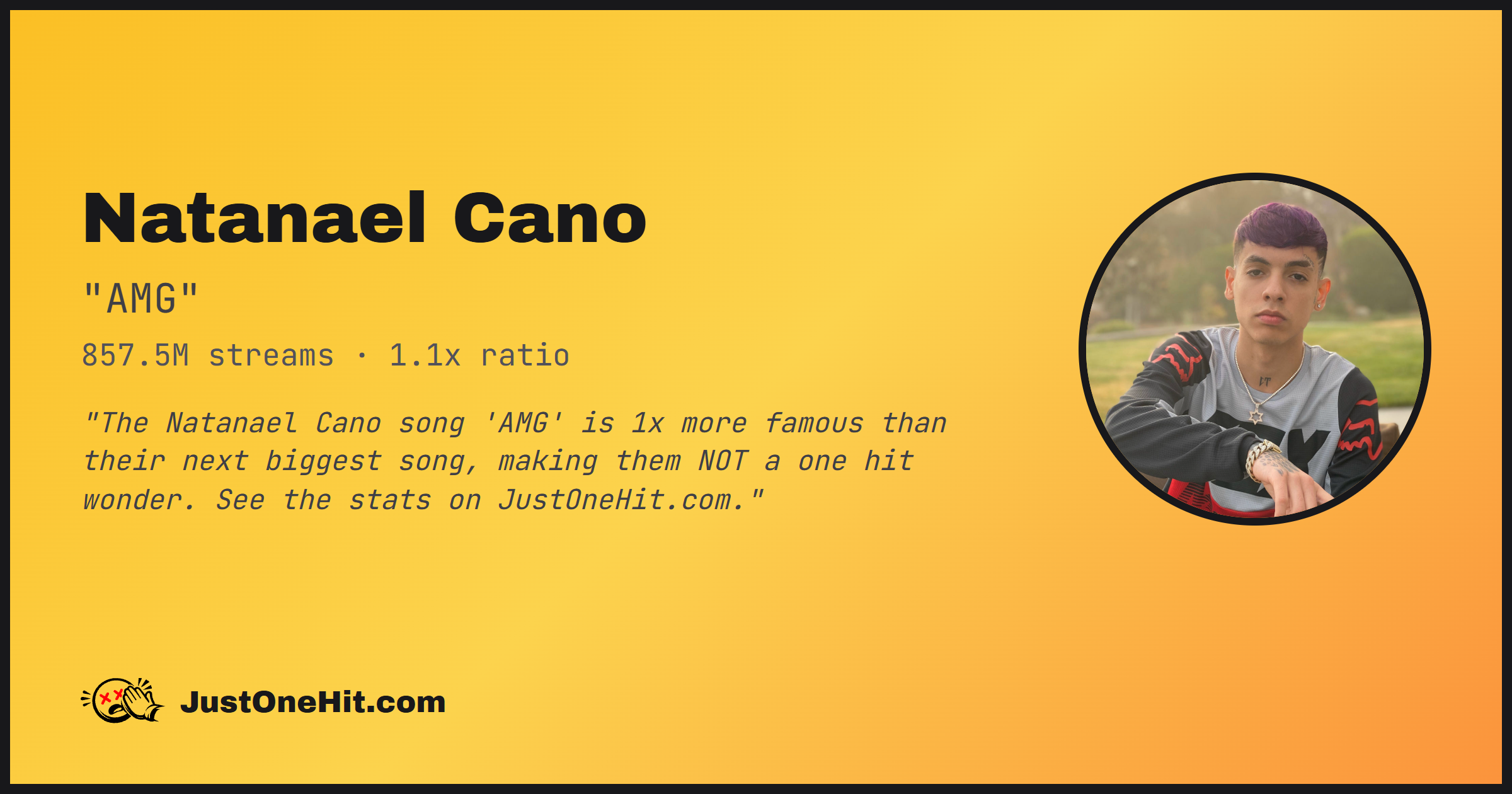 "The Natanael Cano song 'AMG' is 1x more famous than their next biggest song, making them NOT a one hit wonder. See the stats on JustOneHit.com."