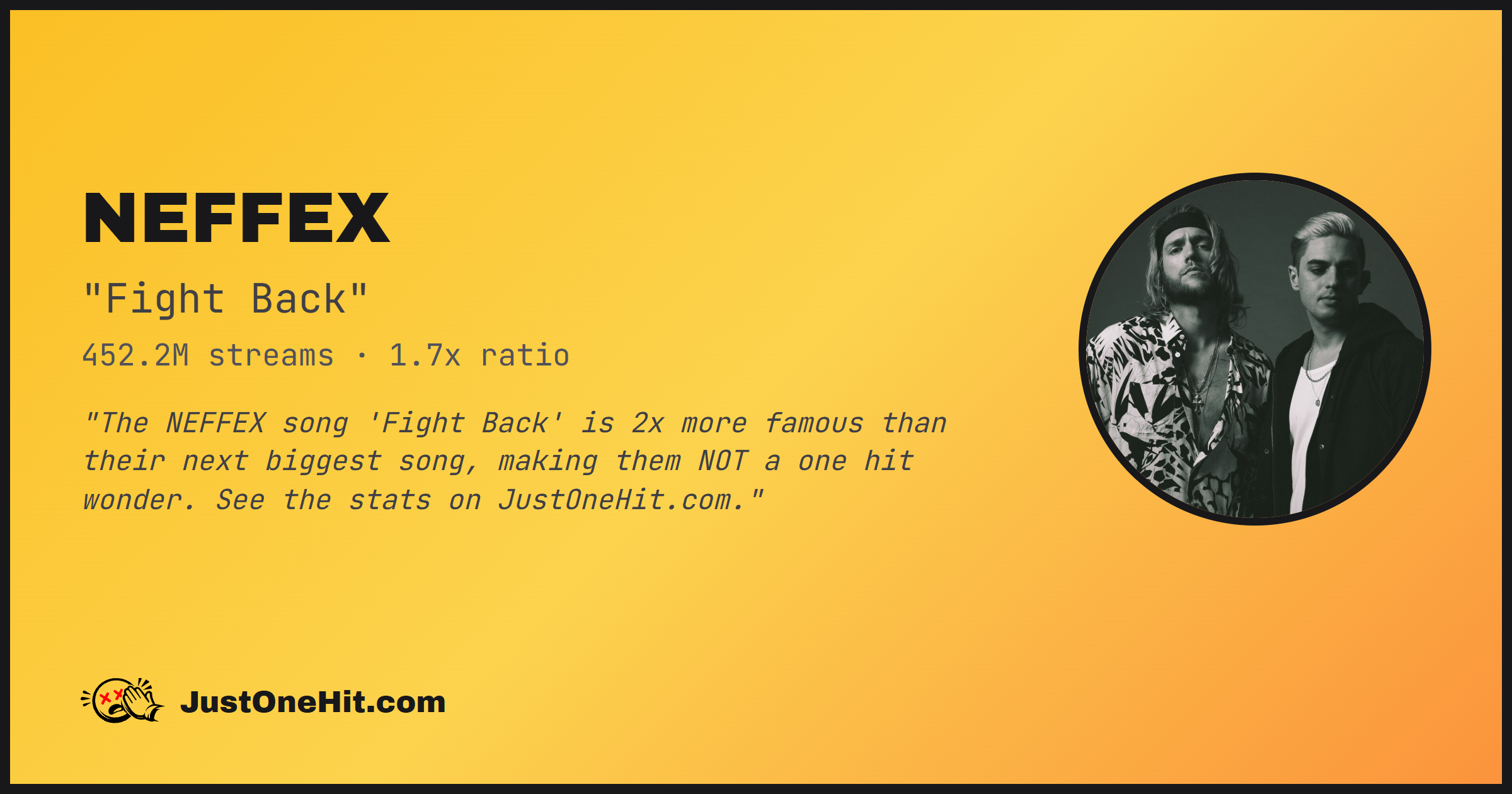 "The NEFFEX song 'Fight Back' is 2x more famous than their next biggest song, making them NOT a one hit wonder. See the stats on JustOneHit.com."