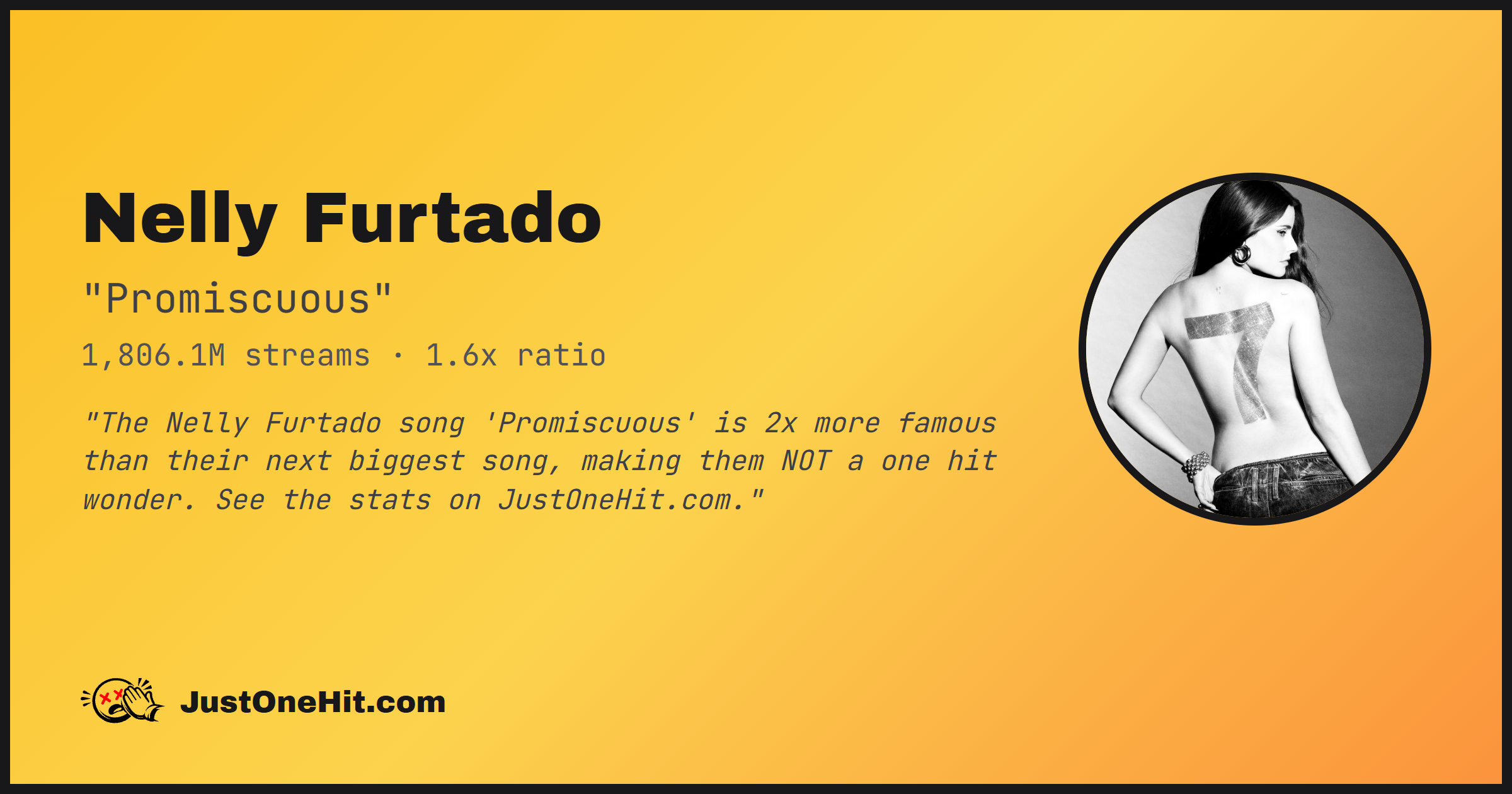 "The Nelly Furtado song 'Promiscuous' is 2x more famous than their next biggest song, making them NOT a one hit wonder. See the stats on JustOneHit.com."