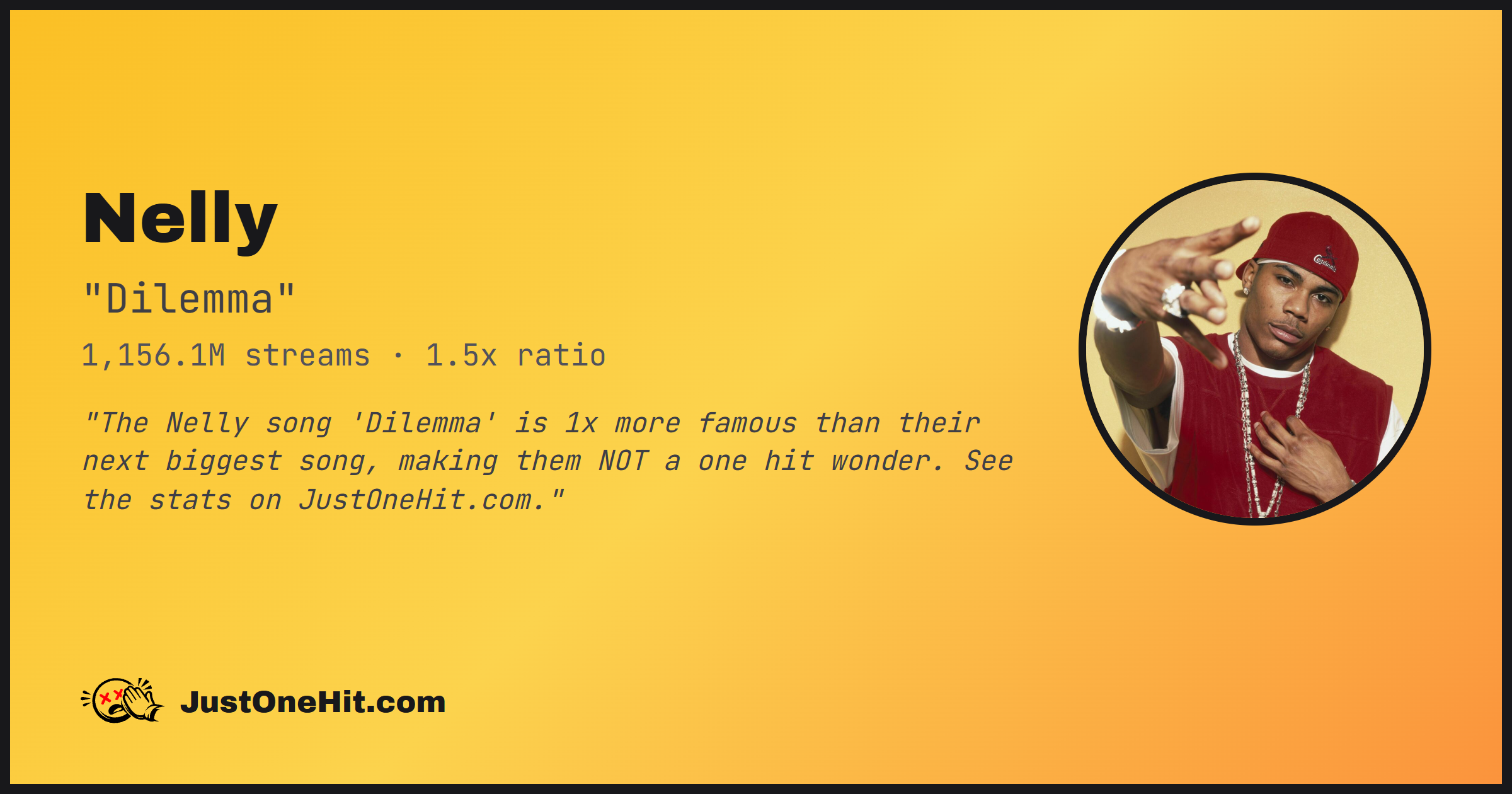 "The Nelly song 'Dilemma' is 1x more famous than their next biggest song, making them NOT a one hit wonder. See the stats on JustOneHit.com."