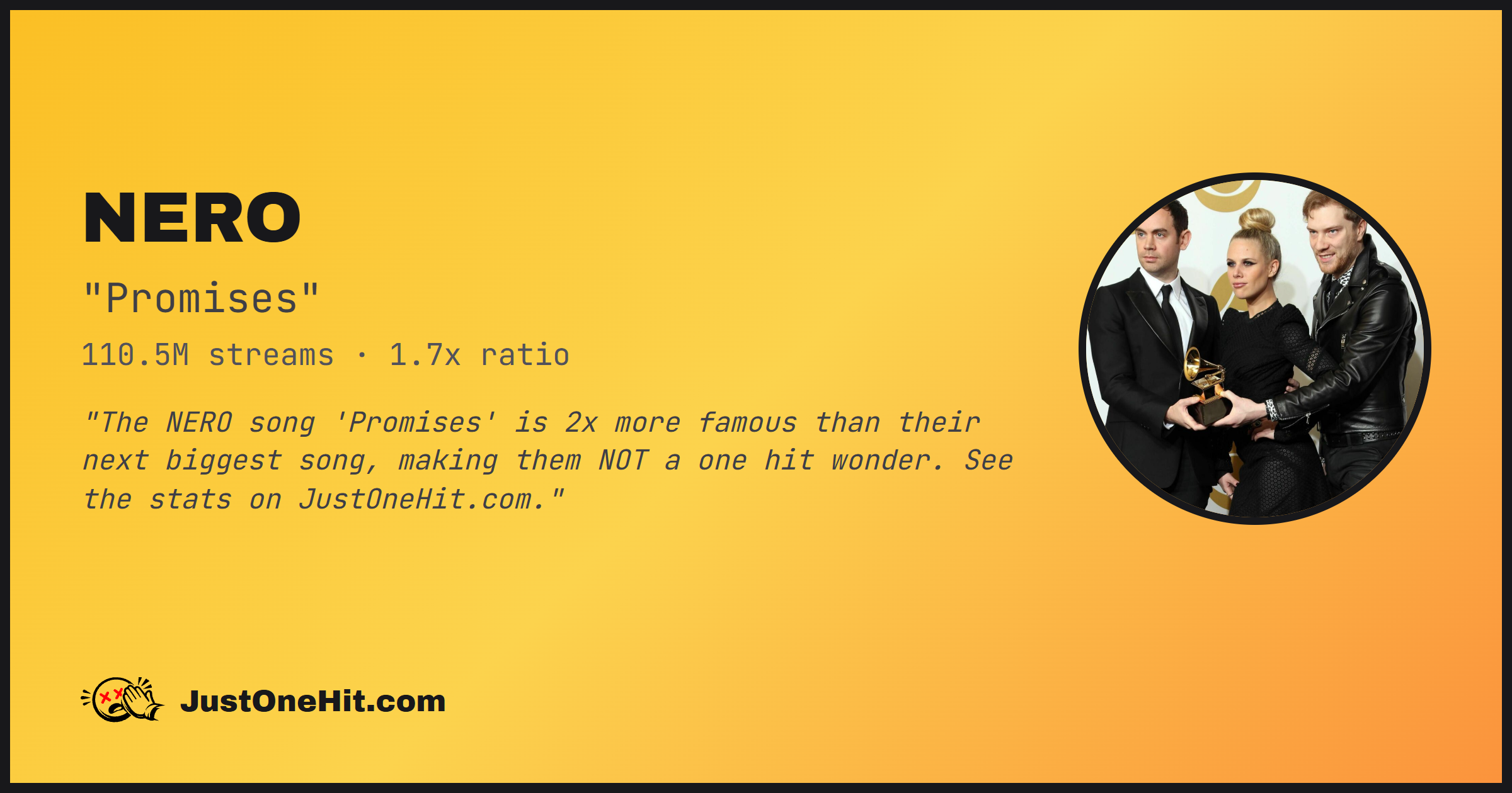 "The NERO song 'Promises' is 2x more famous than their next biggest song, making them NOT a one hit wonder. See the stats on JustOneHit.com."