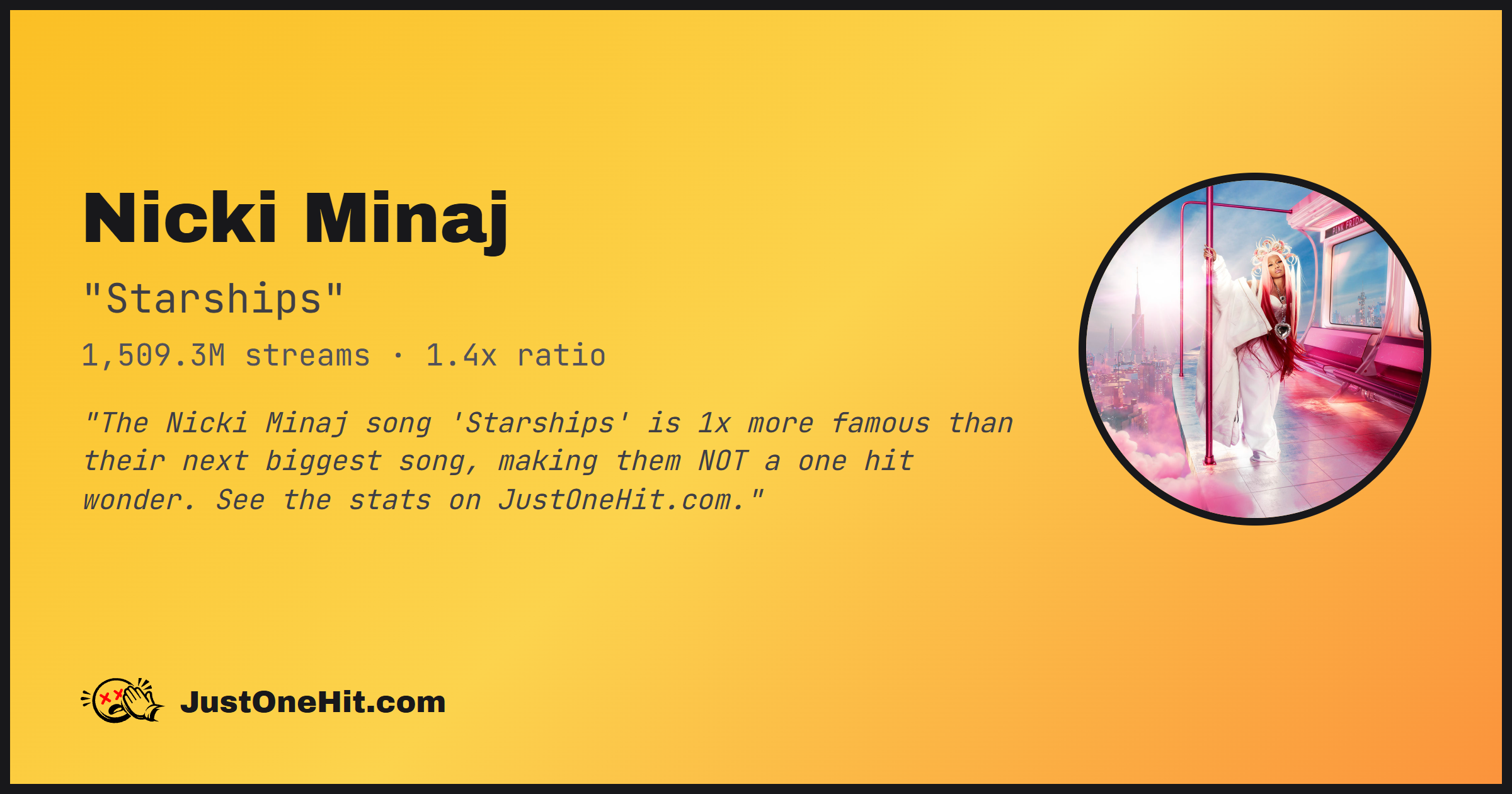 "The Nicki Minaj song 'Starships' is 1x more famous than their next biggest song, making them NOT a one hit wonder. See the stats on JustOneHit.com."