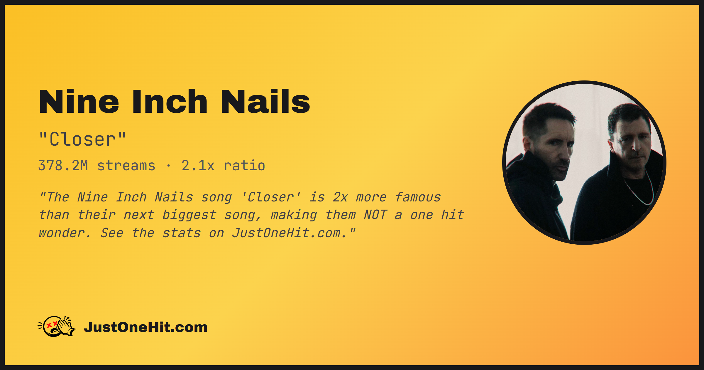 "The Nine Inch Nails song 'Closer' is 2x more famous than their next biggest song, making them NOT a one hit wonder. See the stats on JustOneHit.com."