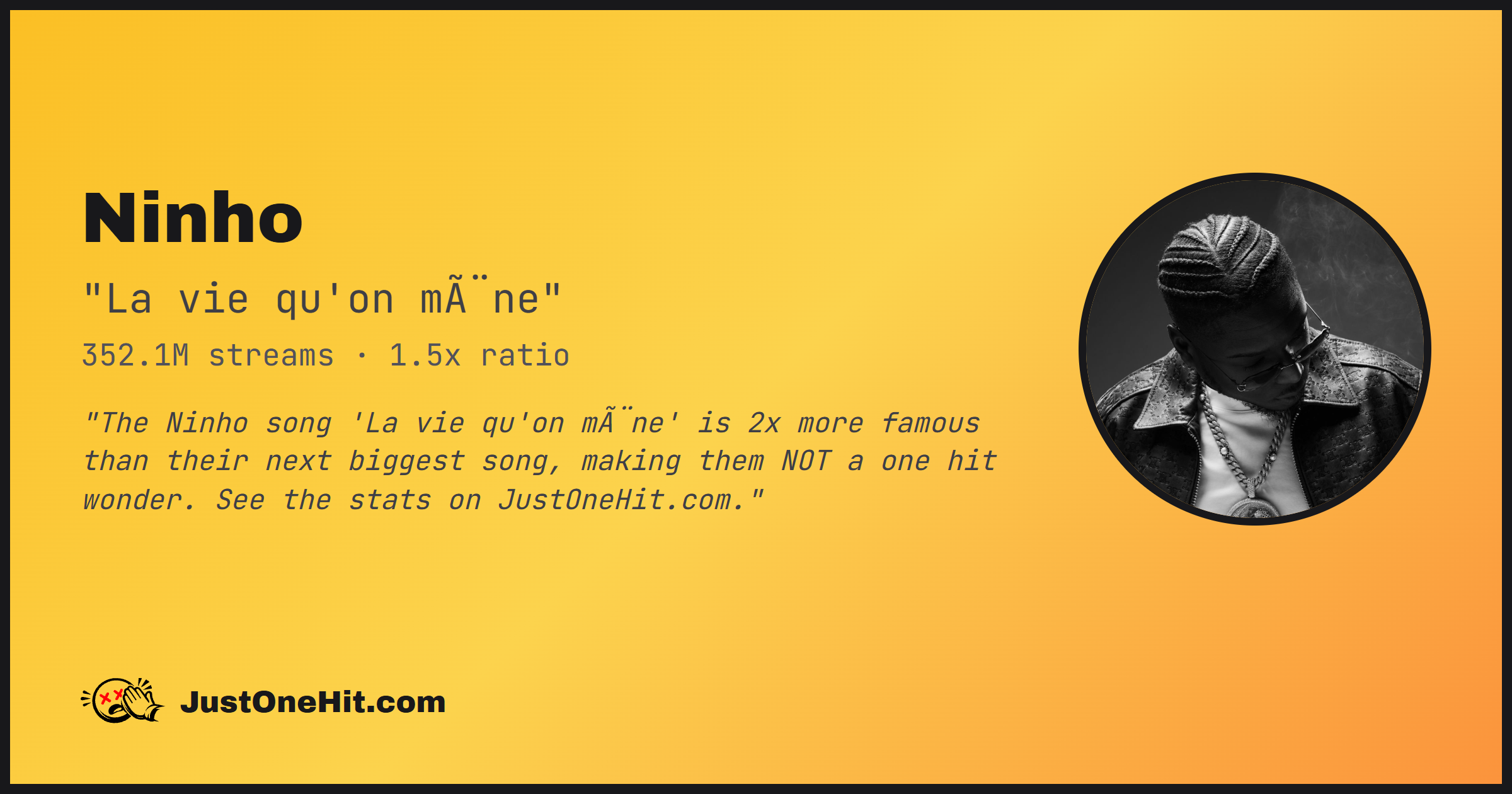 "The Ninho song 'La vie qu'on mène' is 2x more famous than their next biggest song, making them NOT a one hit wonder. See the stats on JustOneHit.com."