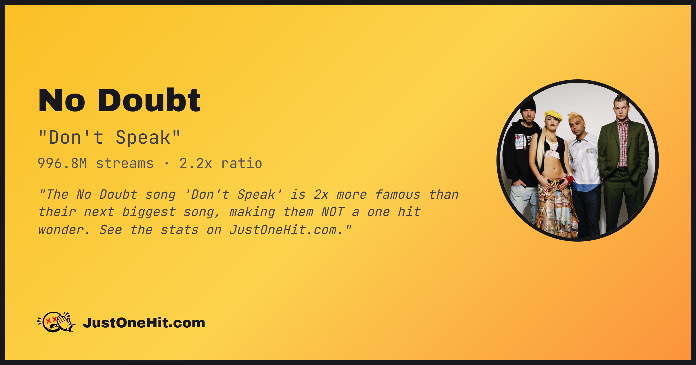 "The No Doubt song 'Don't Speak' is 2x more famous than their next biggest song, making them NOT a one hit wonder. See the stats on JustOneHit.com."