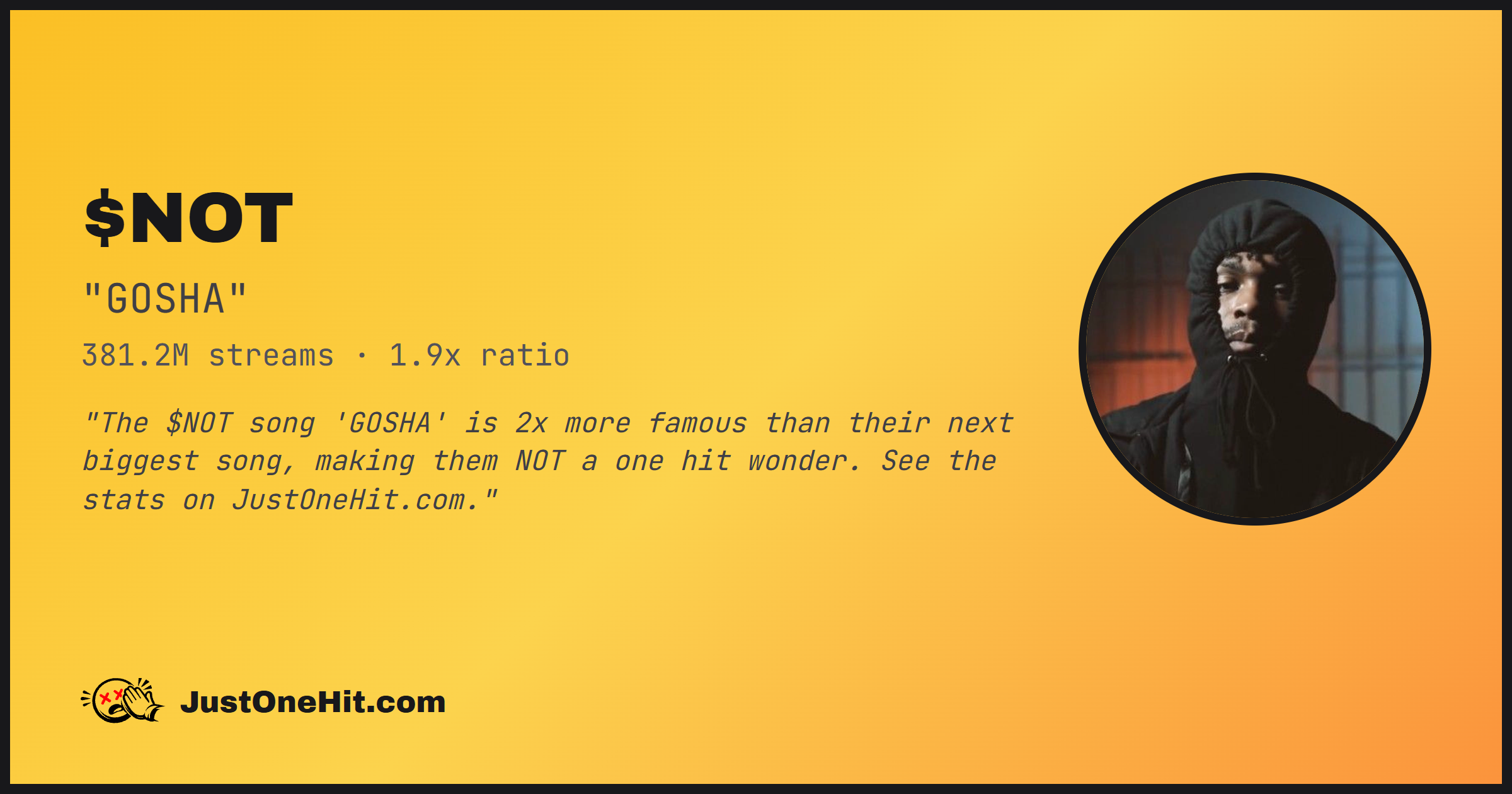 "The $NOT song 'GOSHA' is 2x more famous than their next biggest song, making them NOT a one hit wonder. See the stats on JustOneHit.com."