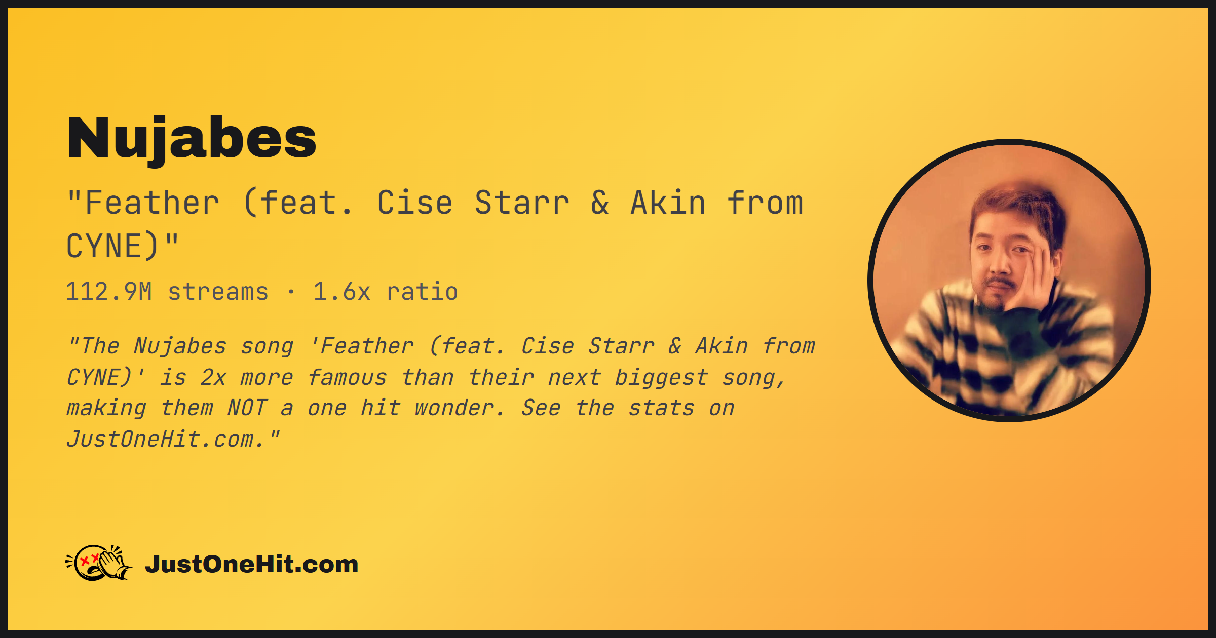 "The Nujabes song 'Feather (feat. Cise Starr & Akin from CYNE)' is 2x more famous than their next biggest song, making them NOT a one hit wonder. See the stats on JustOneHit.com."