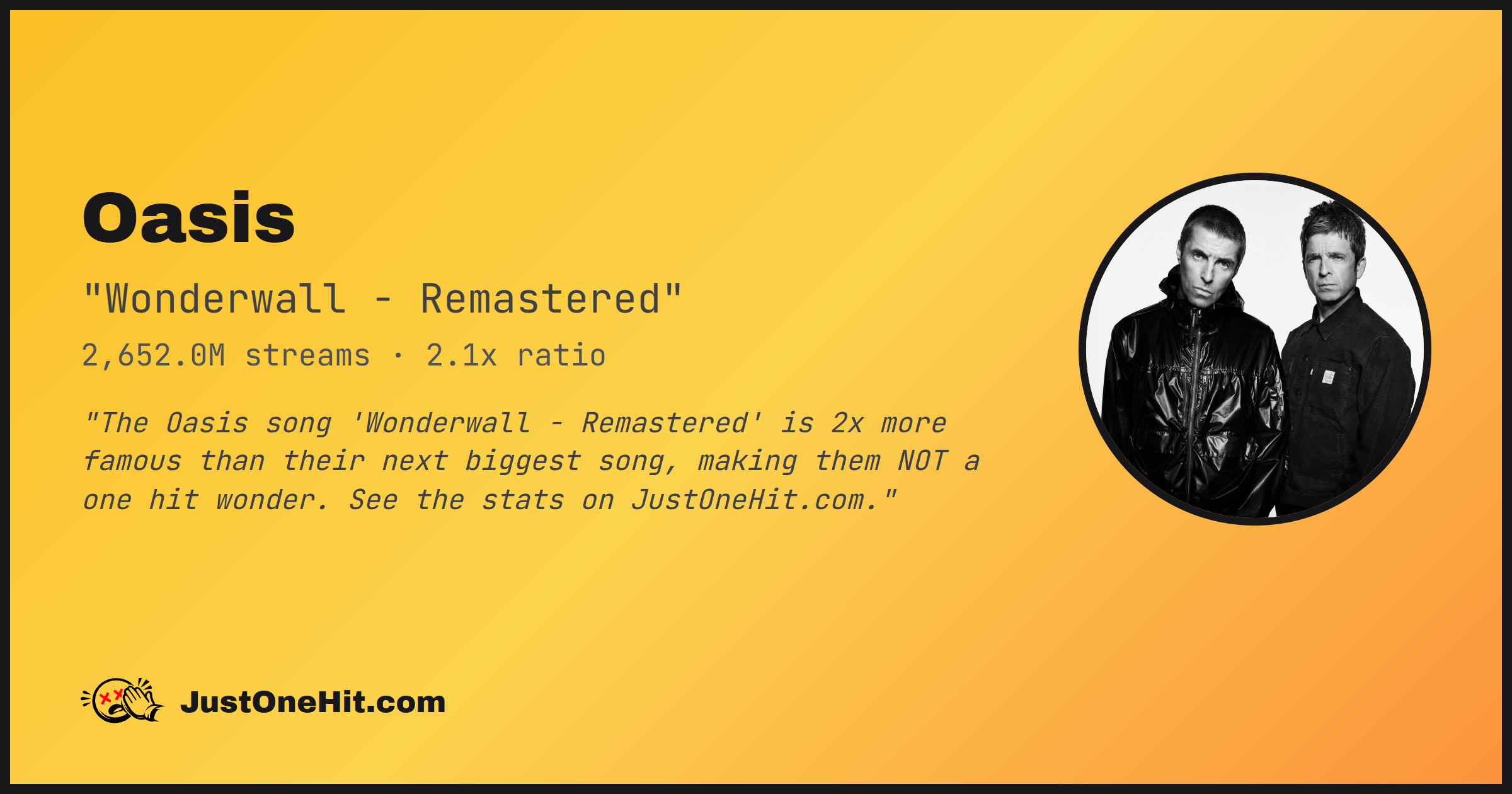 "The Oasis song 'Wonderwall - Remastered' is 2x more famous than their next biggest song, making them NOT a one hit wonder. See the stats on JustOneHit.com."