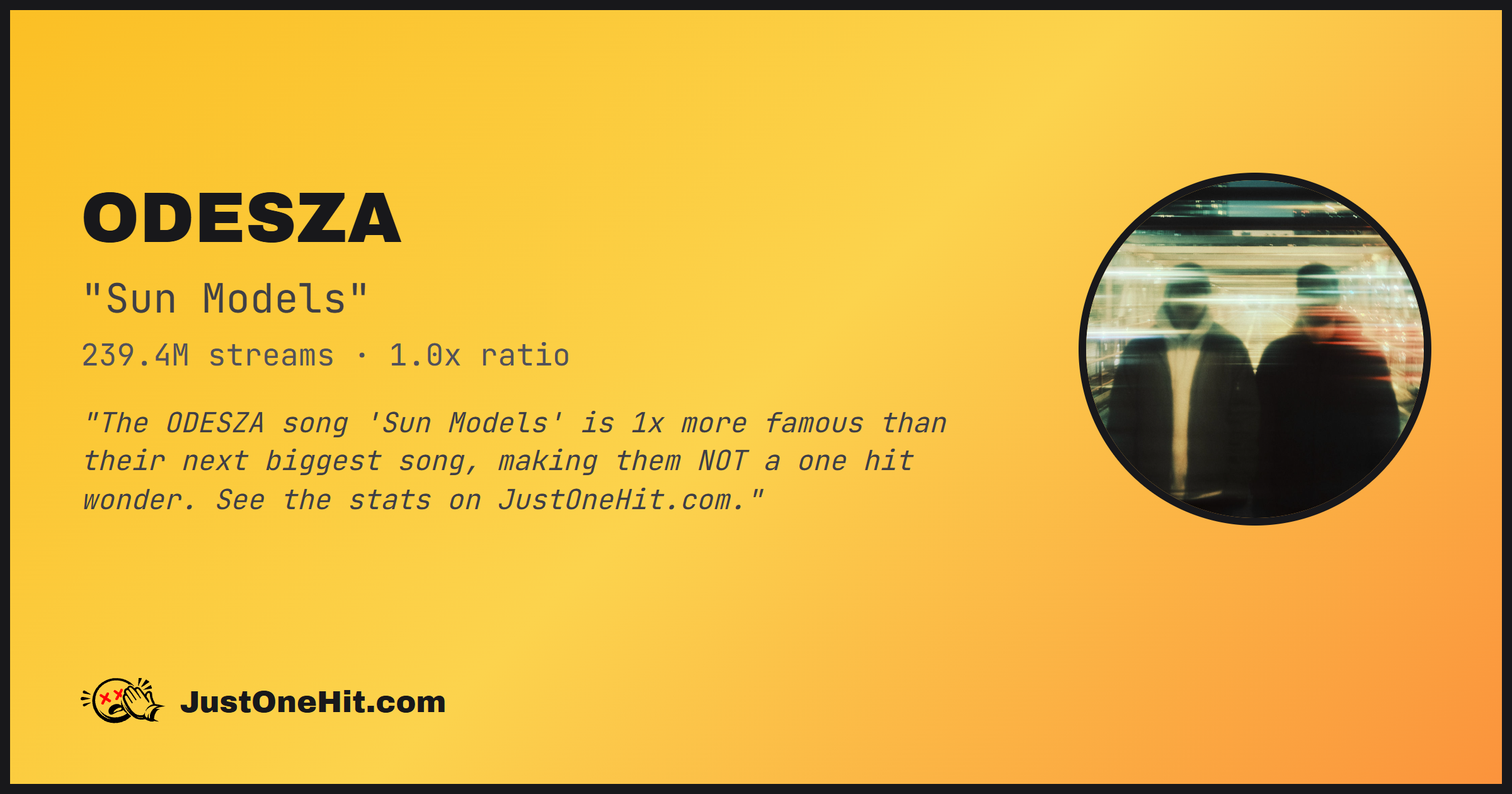 "The ODESZA song 'Sun Models' is 1x more famous than their next biggest song, making them NOT a one hit wonder. See the stats on JustOneHit.com."