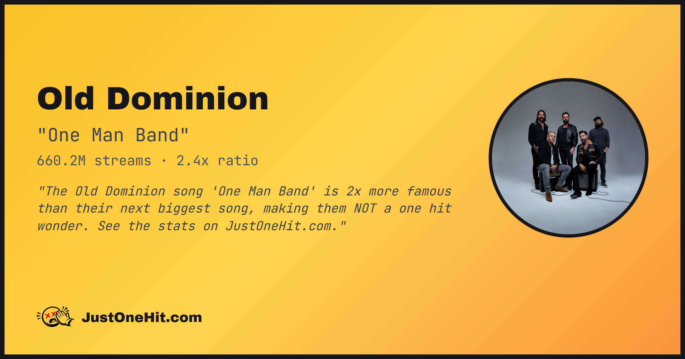 "The Old Dominion song 'One Man Band' is 2x more famous than their next biggest song, making them NOT a one hit wonder. See the stats on JustOneHit.com."