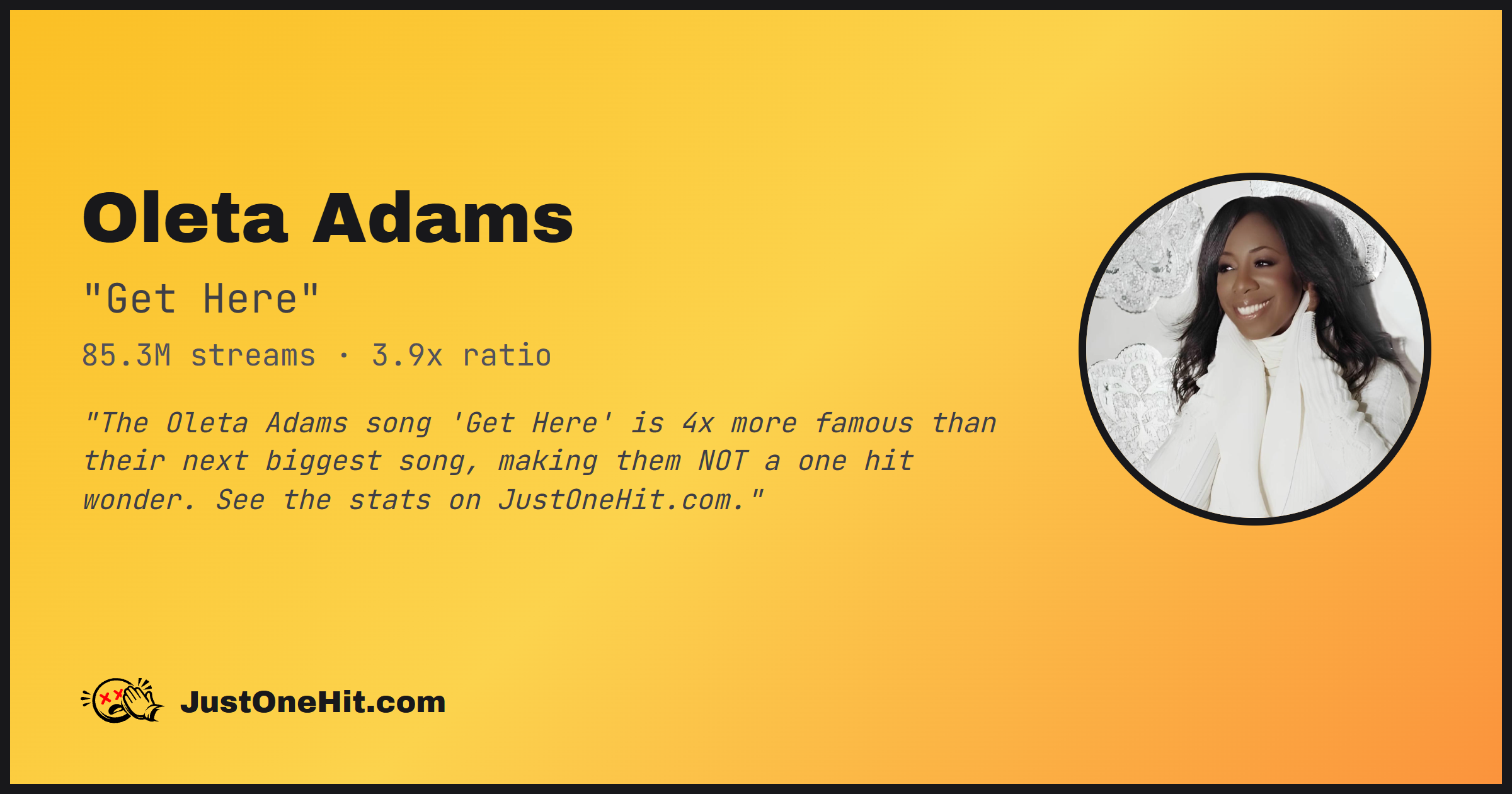 "The Oleta Adams song 'Get Here' is 4x more famous than their next biggest song, making them NOT a one hit wonder. See the stats on JustOneHit.com."