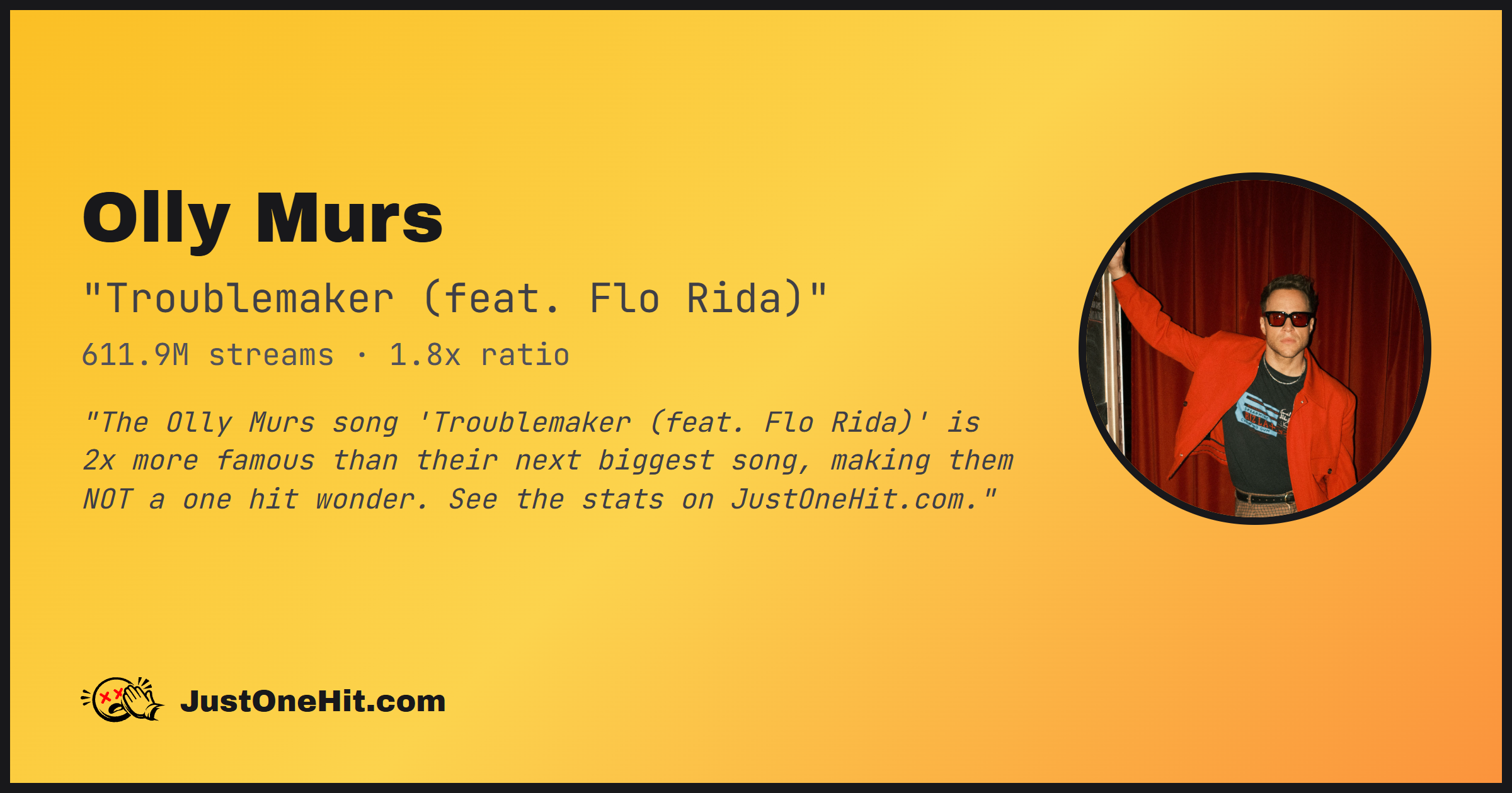 "The Olly Murs song 'Troublemaker (feat. Flo Rida)' is 2x more famous than their next biggest song, making them NOT a one hit wonder. See the stats on JustOneHit.com."