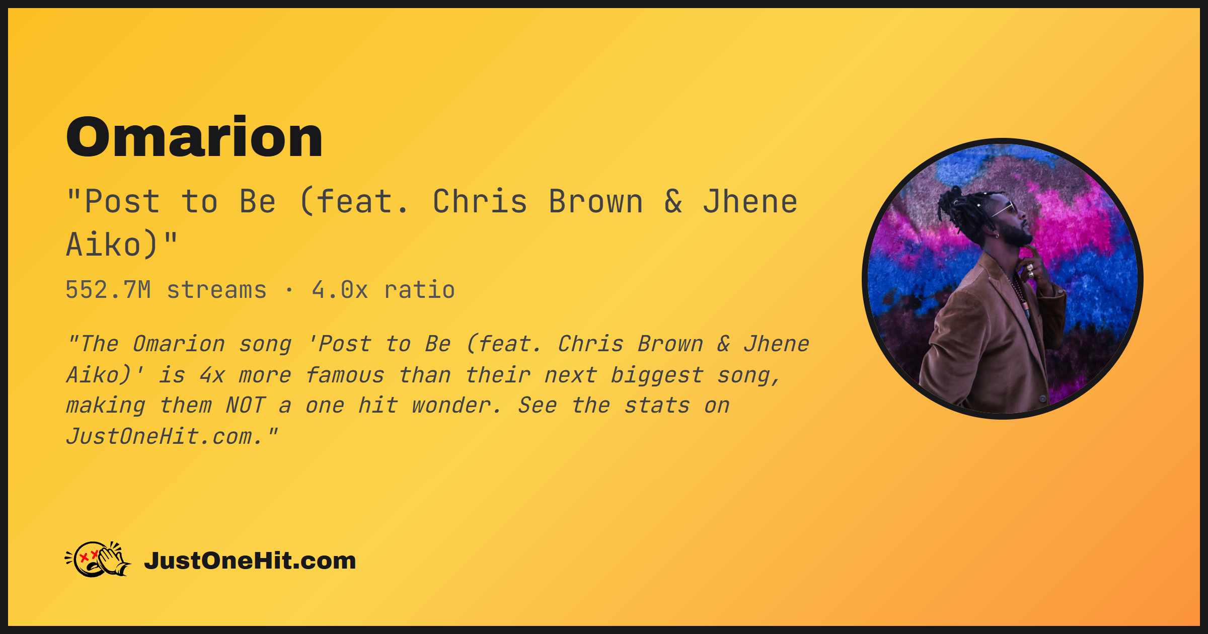 "The Omarion song 'Post to Be (feat. Chris Brown & Jhene Aiko)' is 4x more famous than their next biggest song, making them NOT a one hit wonder. See the stats on JustOneHit.com."
