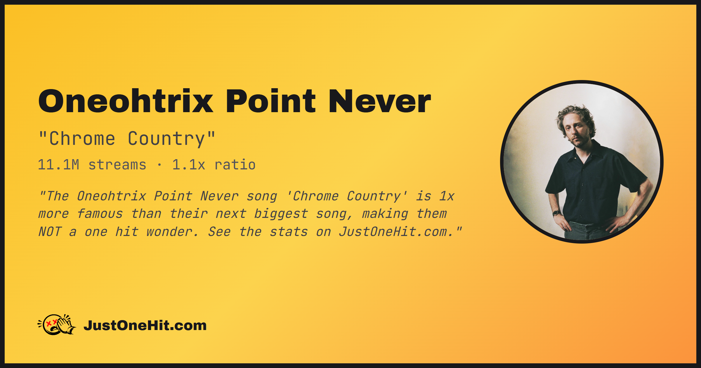 "The Oneohtrix Point Never song 'Chrome Country' is 1x more famous than their next biggest song, making them NOT a one hit wonder. See the stats on JustOneHit.com."