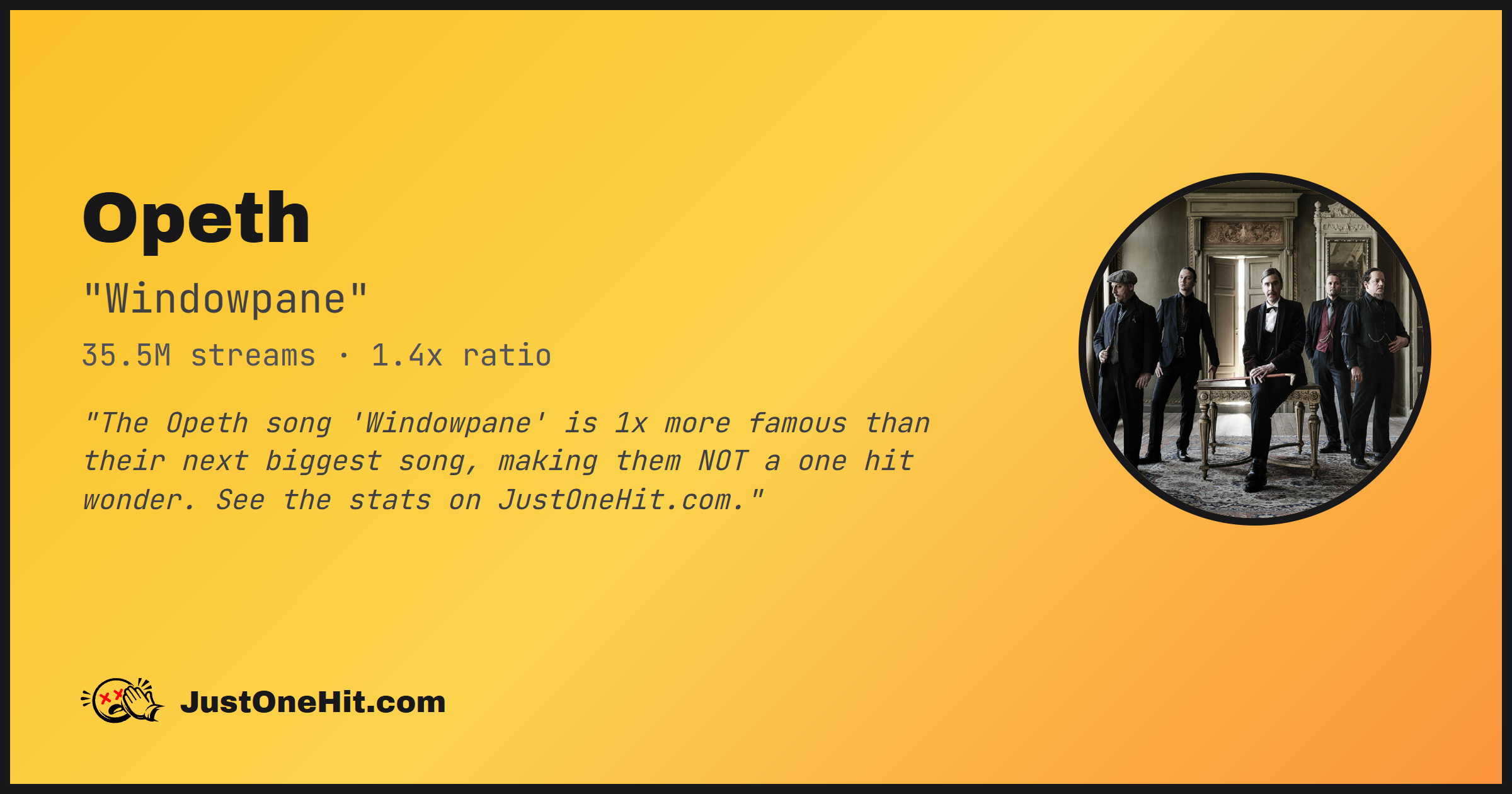 "The Opeth song 'Windowpane' is 1x more famous than their next biggest song, making them NOT a one hit wonder. See the stats on JustOneHit.com."