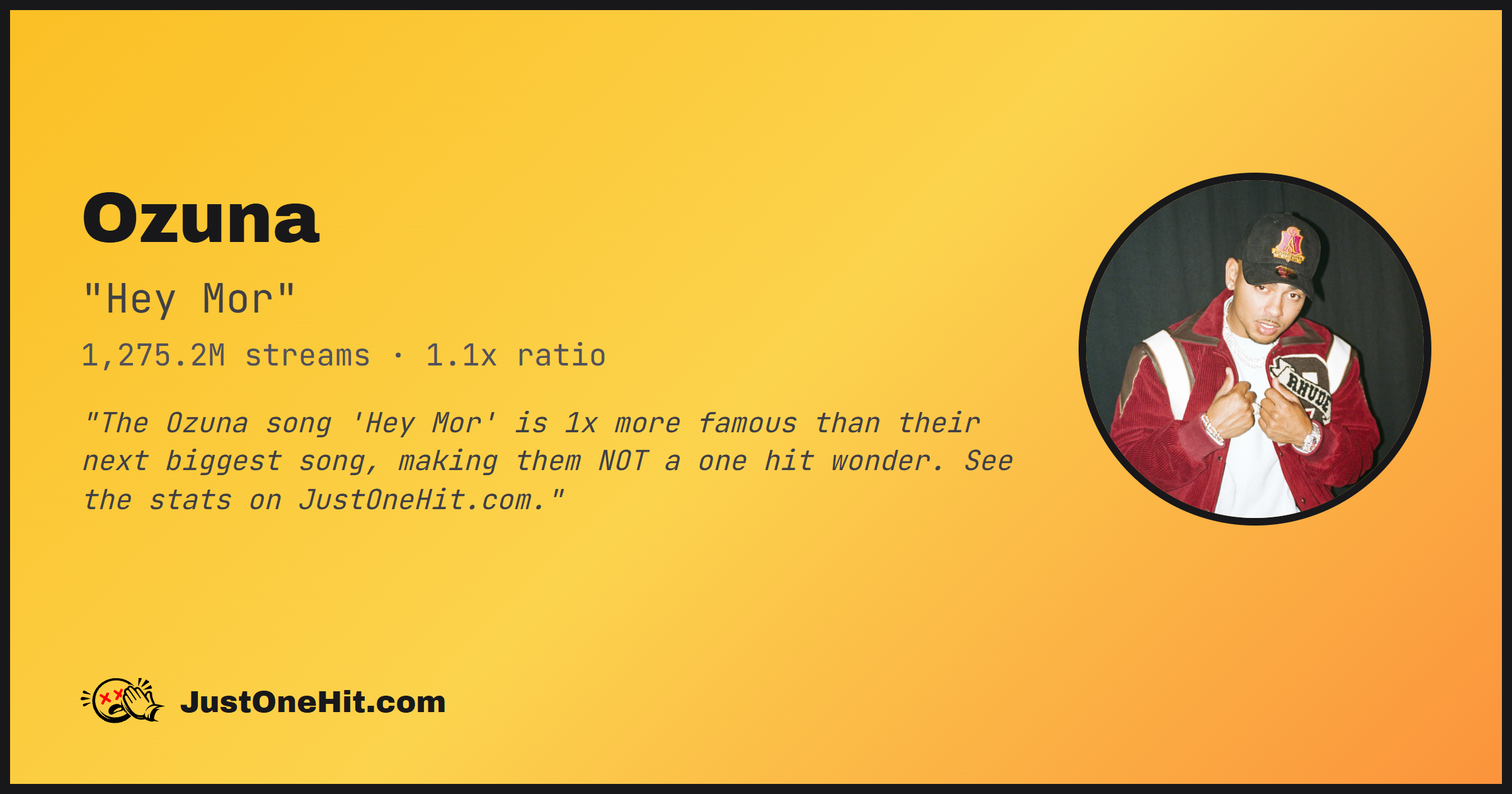 "The Ozuna song 'Hey Mor' is 1x more famous than their next biggest song, making them NOT a one hit wonder. See the stats on JustOneHit.com."