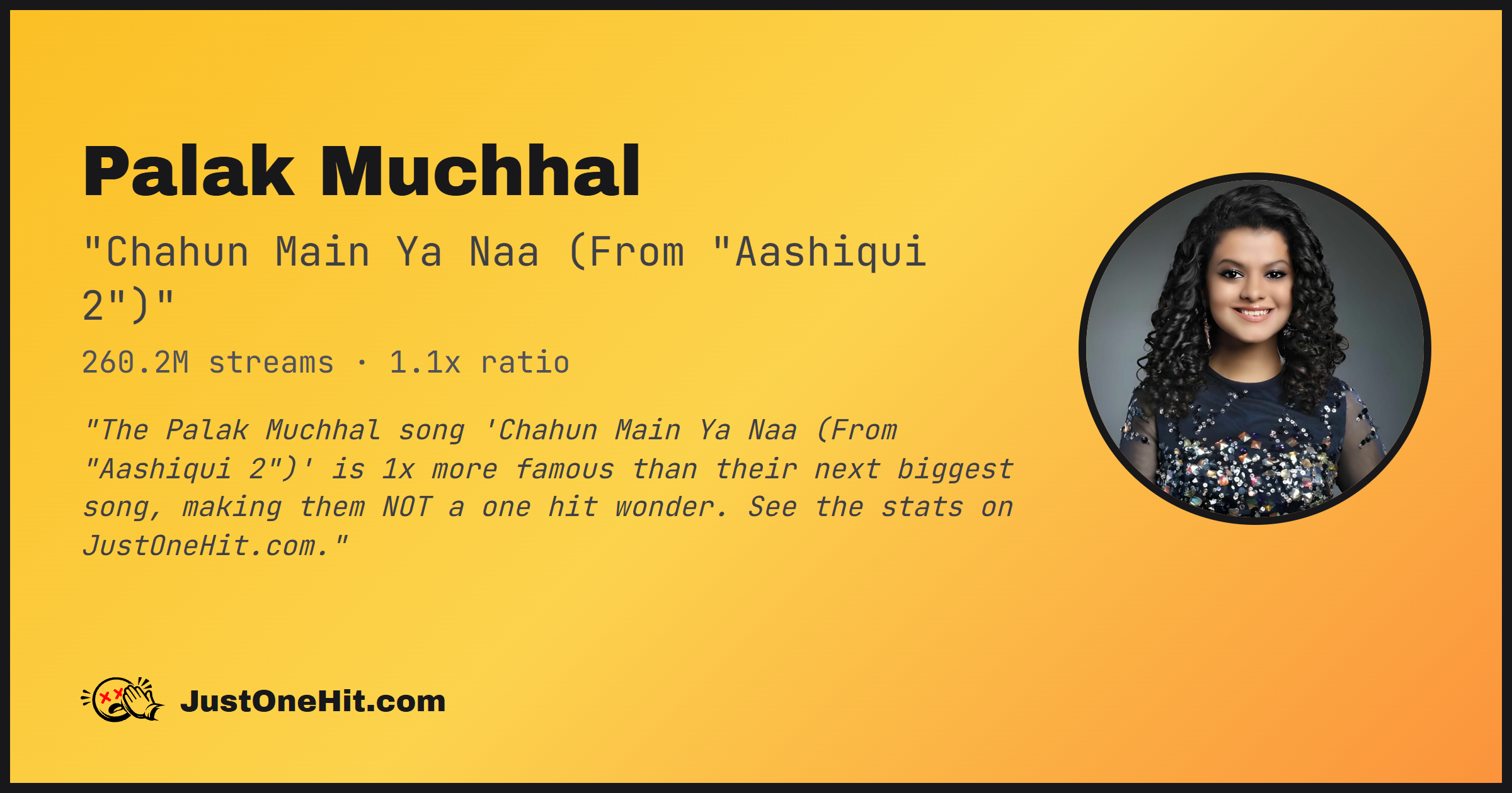 "The Palak Muchhal song 'Chahun Main Ya Naa (From "Aashiqui 2")' is 1x more famous than their next biggest song, making them NOT a one hit wonder. See the stats on JustOneHit.com."