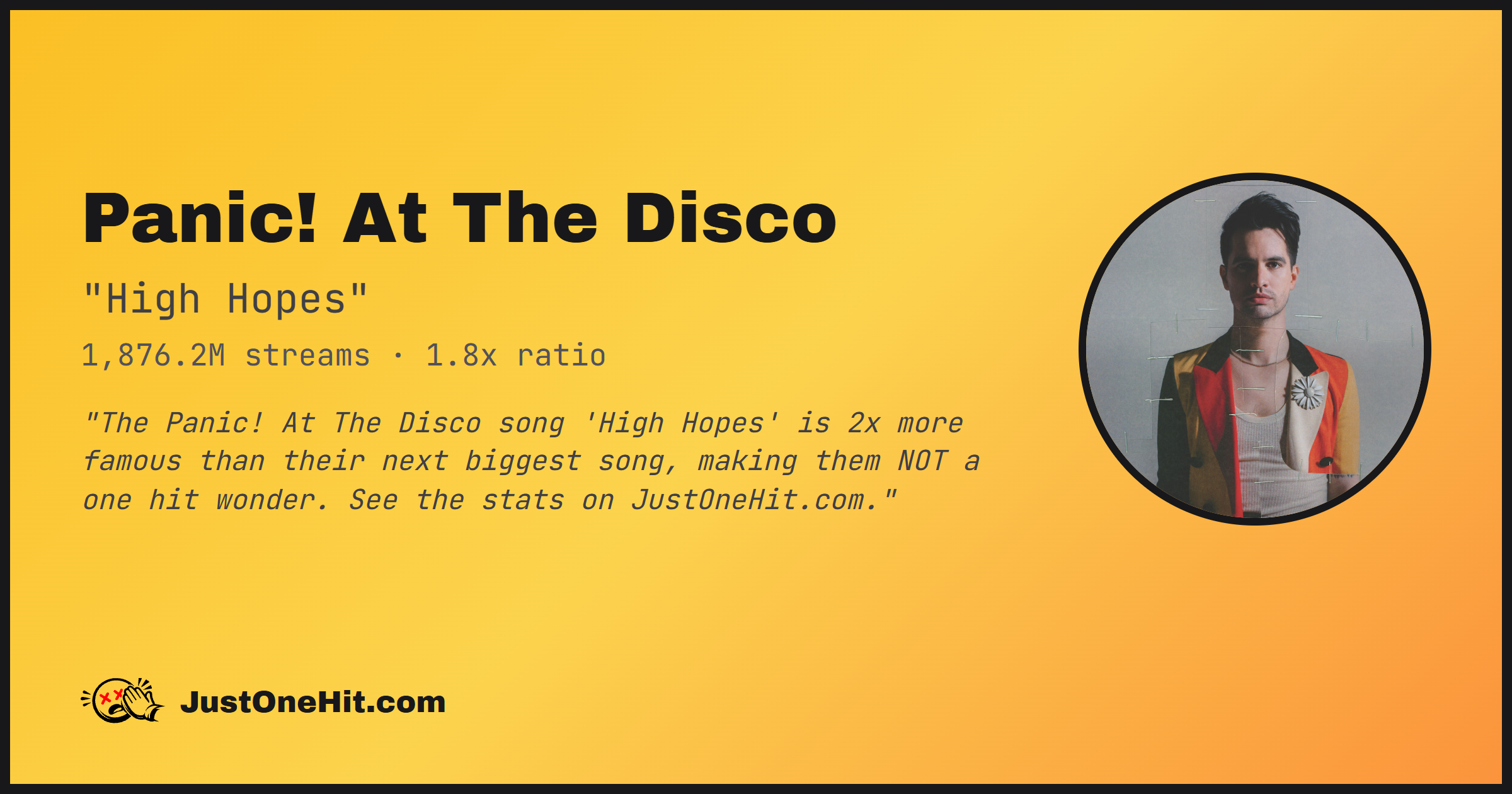 "The Panic! At The Disco song 'High Hopes' is 2x more famous than their next biggest song, making them NOT a one hit wonder. See the stats on JustOneHit.com."