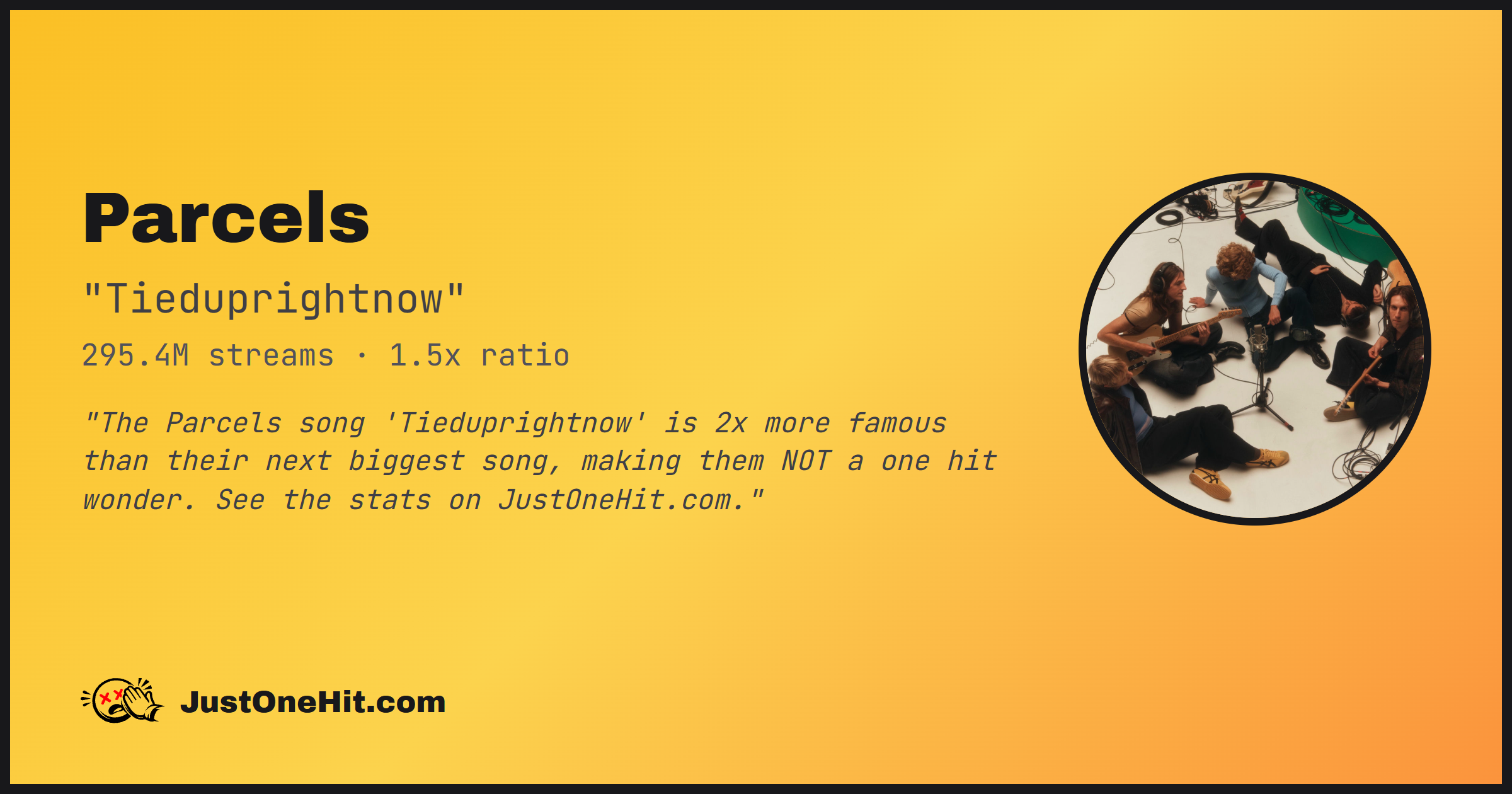 "The Parcels song 'Tieduprightnow' is 2x more famous than their next biggest song, making them NOT a one hit wonder. See the stats on JustOneHit.com."