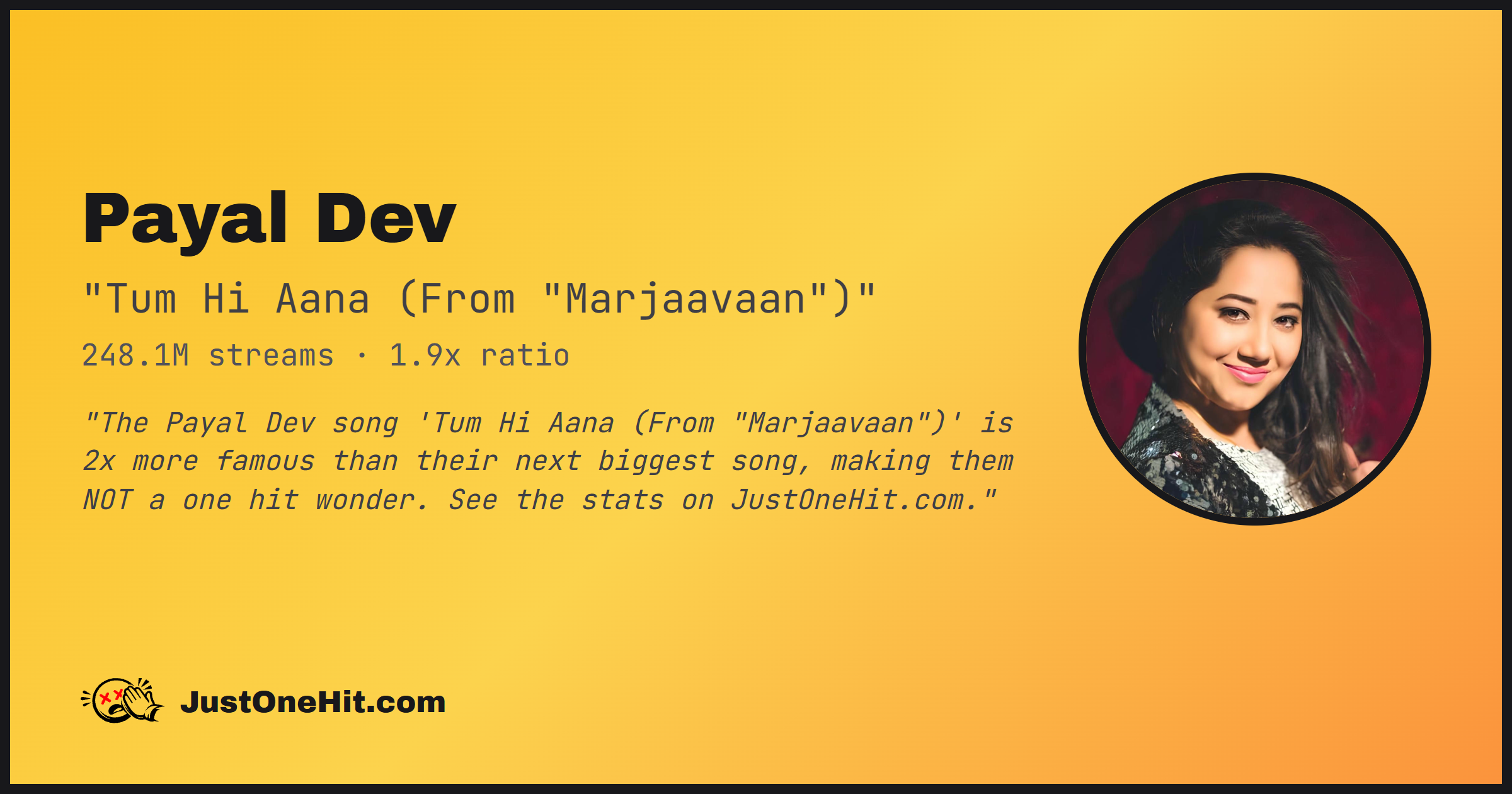 "The Payal Dev song 'Tum Hi Aana (From "Marjaavaan")' is 2x more famous than their next biggest song, making them NOT a one hit wonder. See the stats on JustOneHit.com."