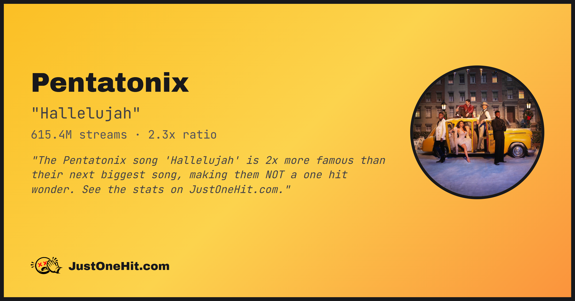 "The Pentatonix song 'Hallelujah' is 2x more famous than their next biggest song, making them NOT a one hit wonder. See the stats on JustOneHit.com."
