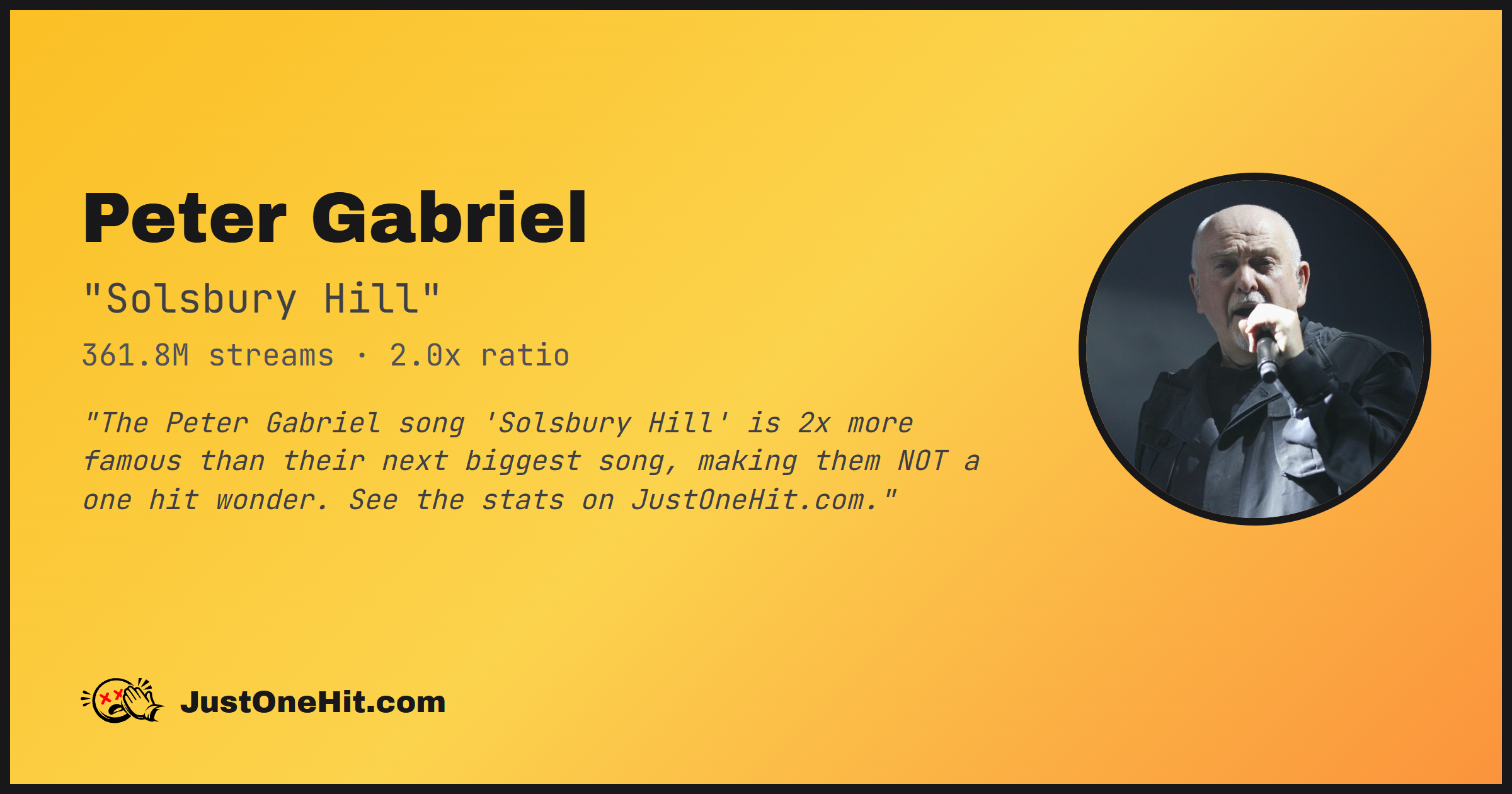 "The Peter Gabriel song 'Solsbury Hill' is 2x more famous than their next biggest song, making them NOT a one hit wonder. See the stats on JustOneHit.com."