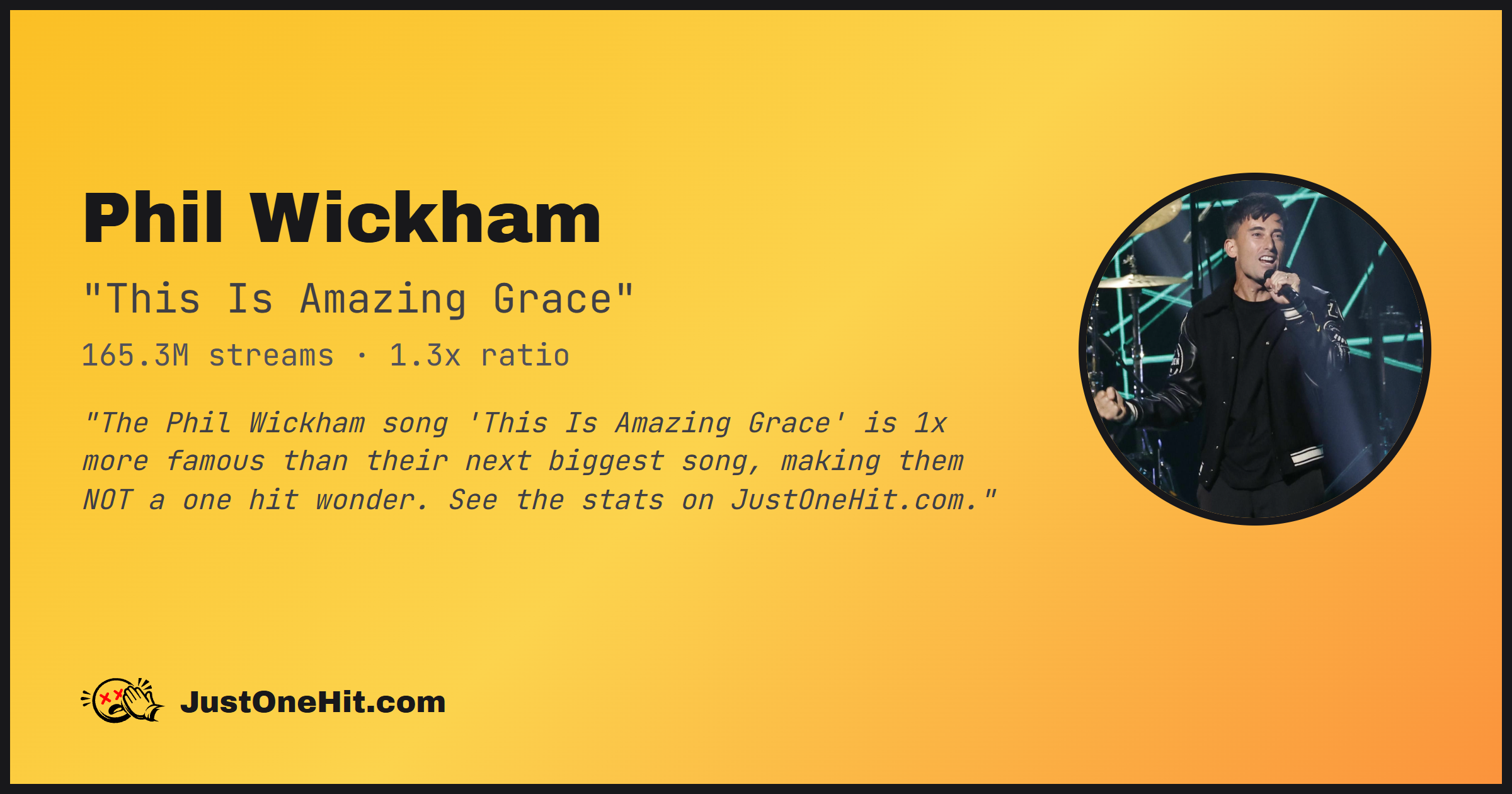 "The Phil Wickham song 'This Is Amazing Grace' is 1x more famous than their next biggest song, making them NOT a one hit wonder. See the stats on JustOneHit.com."