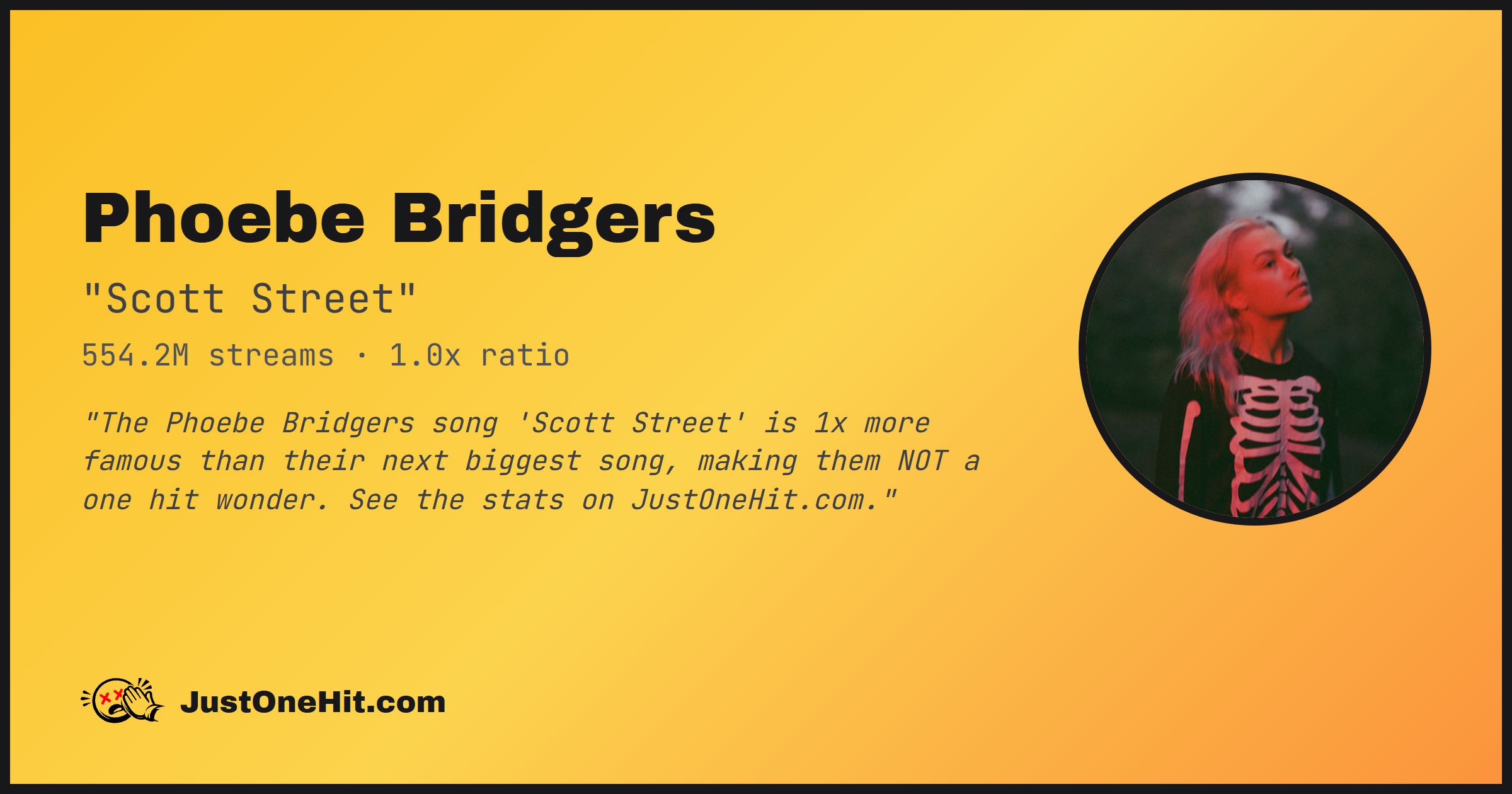 "The Phoebe Bridgers song 'Scott Street' is 1x more famous than their next biggest song, making them NOT a one hit wonder. See the stats on JustOneHit.com."