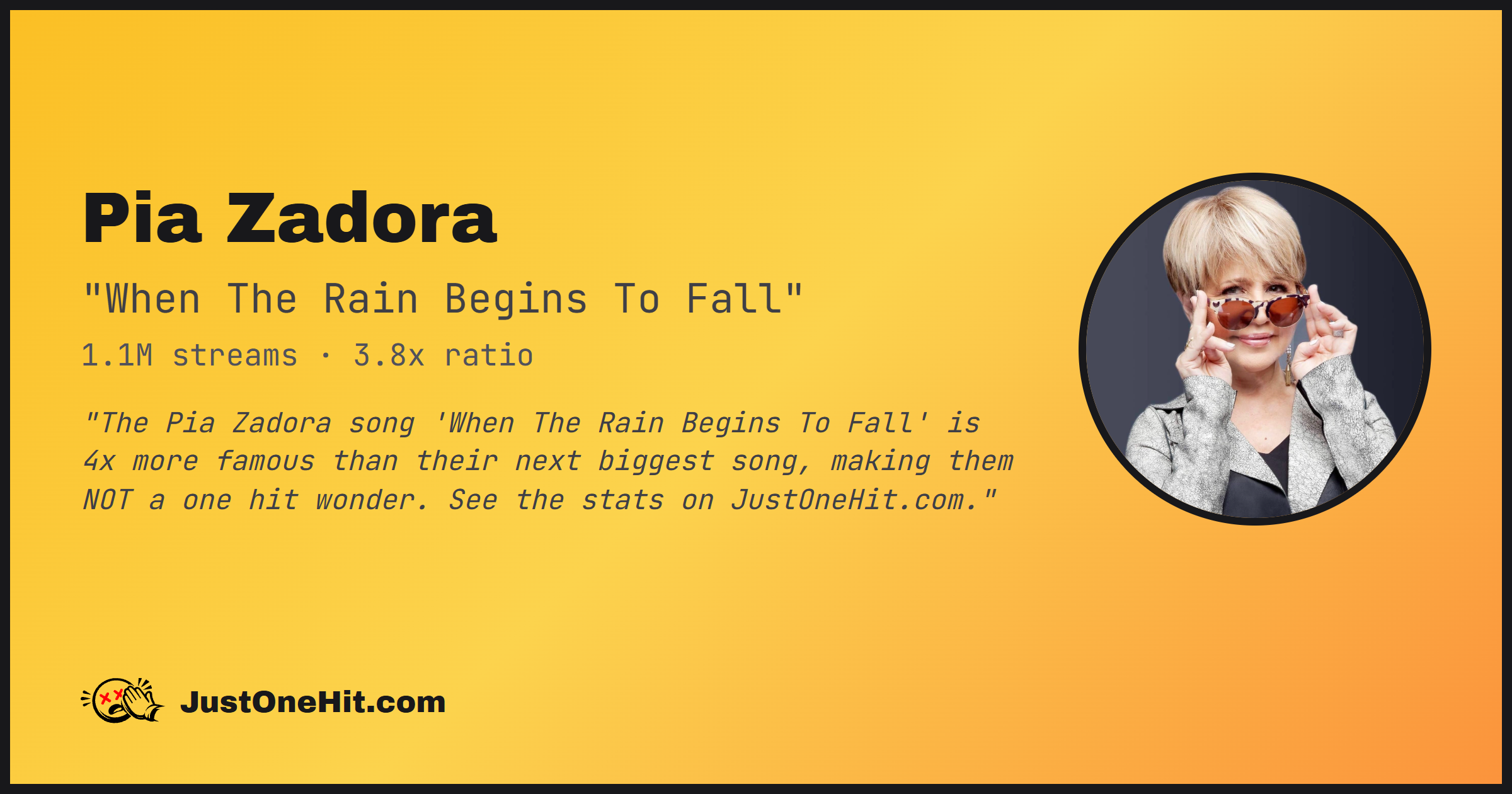 "The Pia Zadora song 'When The Rain Begins To Fall' is 4x more famous than their next biggest song, making them NOT a one hit wonder. See the stats on JustOneHit.com."