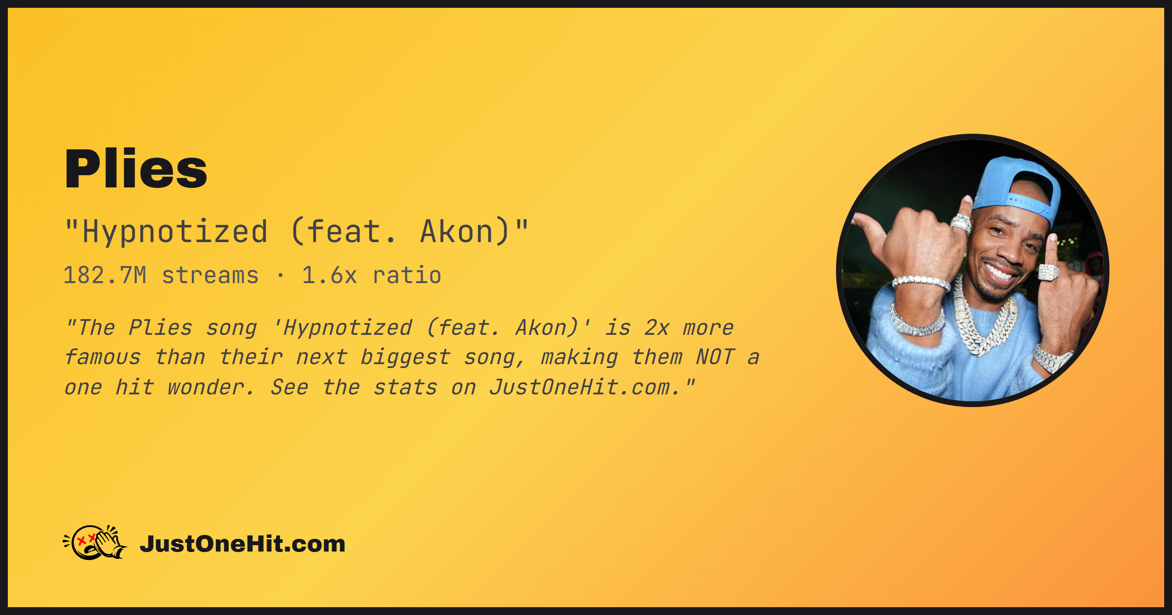 "The Plies song 'Hypnotized (feat. Akon)' is 2x more famous than their next biggest song, making them NOT a one hit wonder. See the stats on JustOneHit.com."