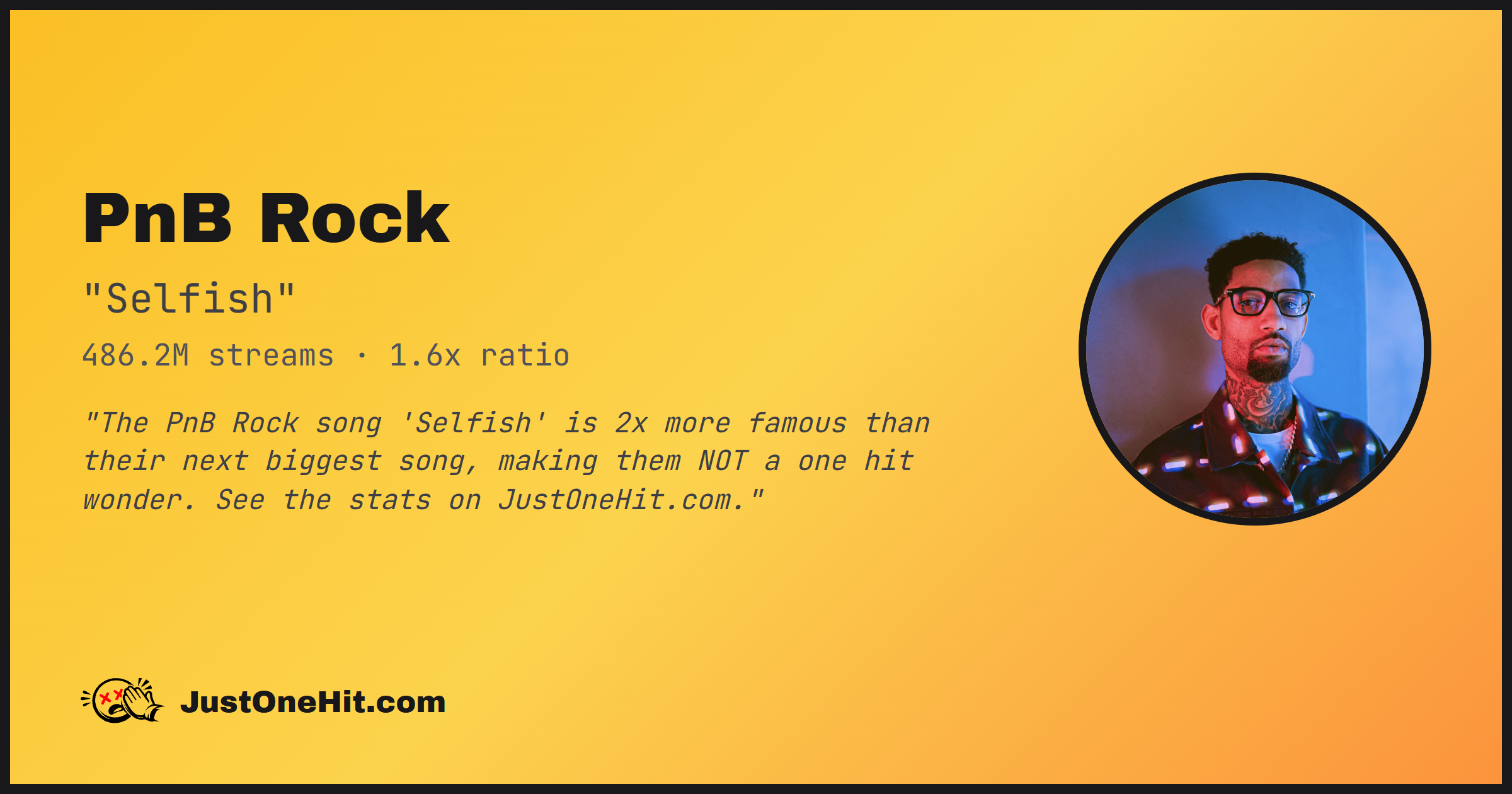 "The PnB Rock song 'Selfish' is 2x more famous than their next biggest song, making them NOT a one hit wonder. See the stats on JustOneHit.com."