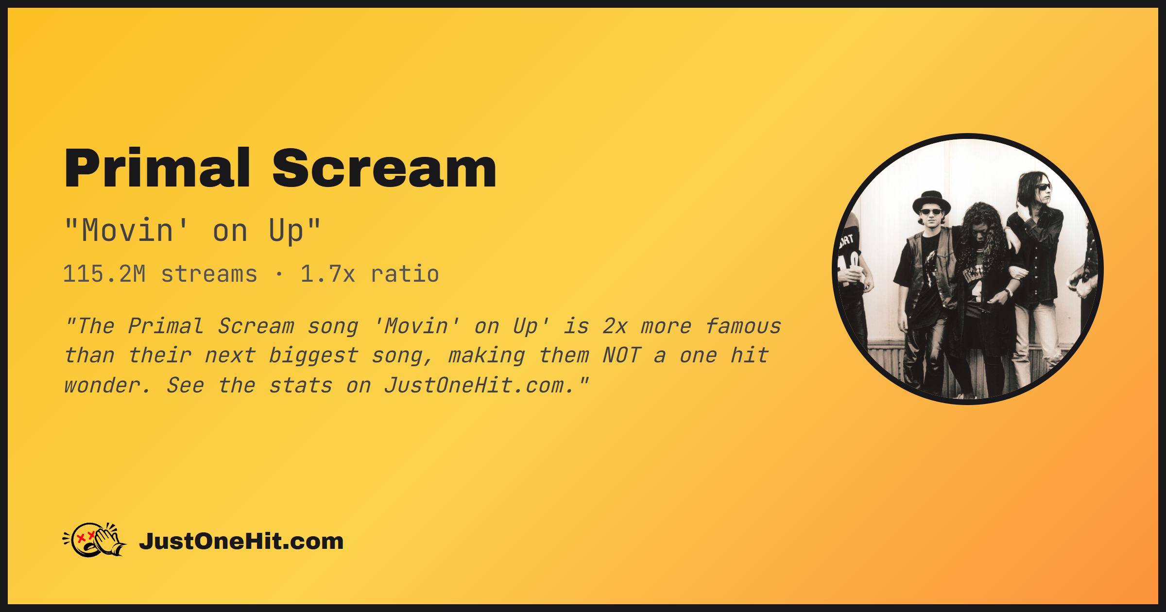 "The Primal Scream song 'Movin' on Up' is 2x more famous than their next biggest song, making them NOT a one hit wonder. See the stats on JustOneHit.com."
