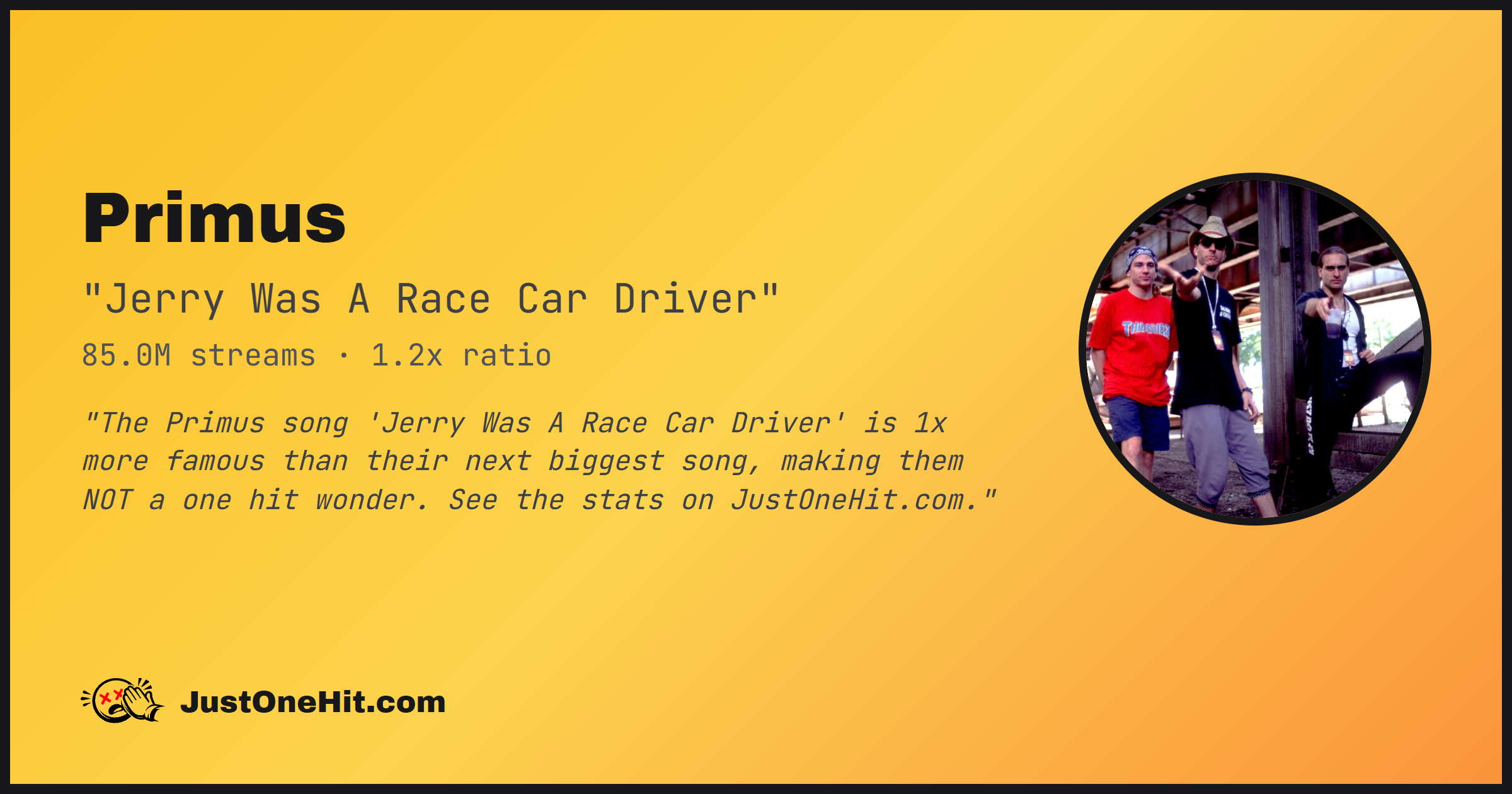 "The Primus song 'Jerry Was A Race Car Driver' is 1x more famous than their next biggest song, making them NOT a one hit wonder. See the stats on JustOneHit.com."