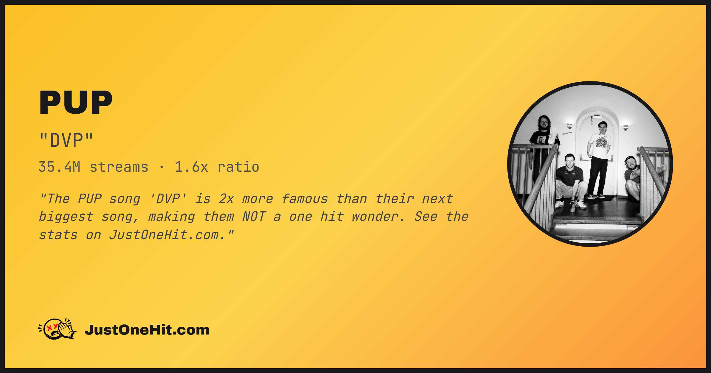 "The PUP song 'DVP' is 2x more famous than their next biggest song, making them NOT a one hit wonder. See the stats on JustOneHit.com."