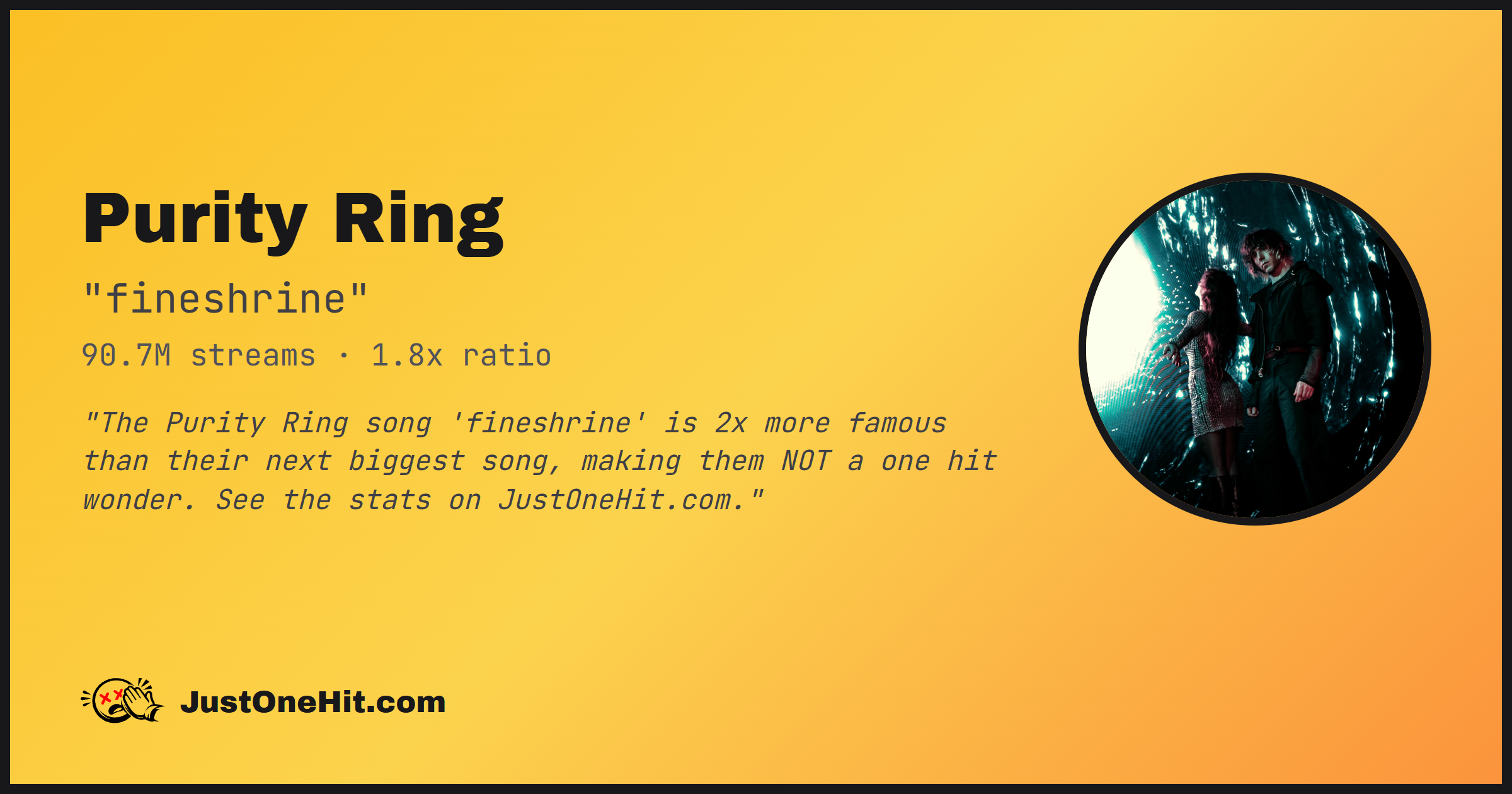 "The Purity Ring song 'fineshrine' is 2x more famous than their next biggest song, making them NOT a one hit wonder. See the stats on JustOneHit.com."