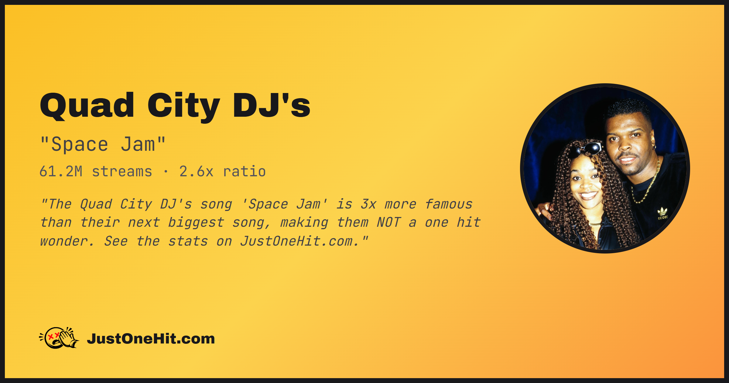 "The Quad City DJ's song 'Space Jam' is 3x more famous than their next biggest song, making them NOT a one hit wonder. See the stats on JustOneHit.com."
