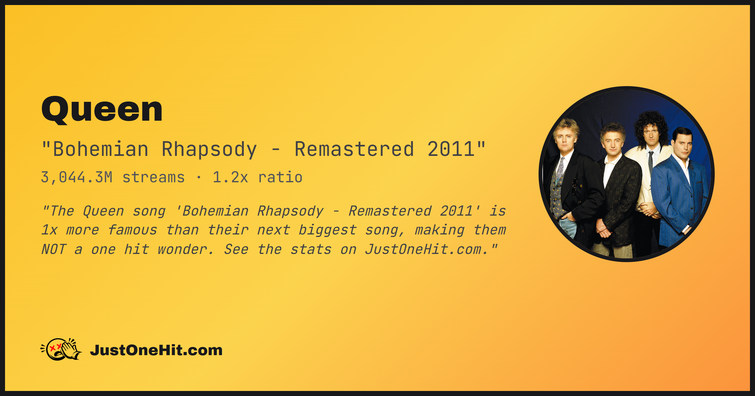 "The Queen song 'Bohemian Rhapsody - Remastered 2011' is 1x more famous than their next biggest song, making them NOT a one hit wonder. See the stats on JustOneHit.com."