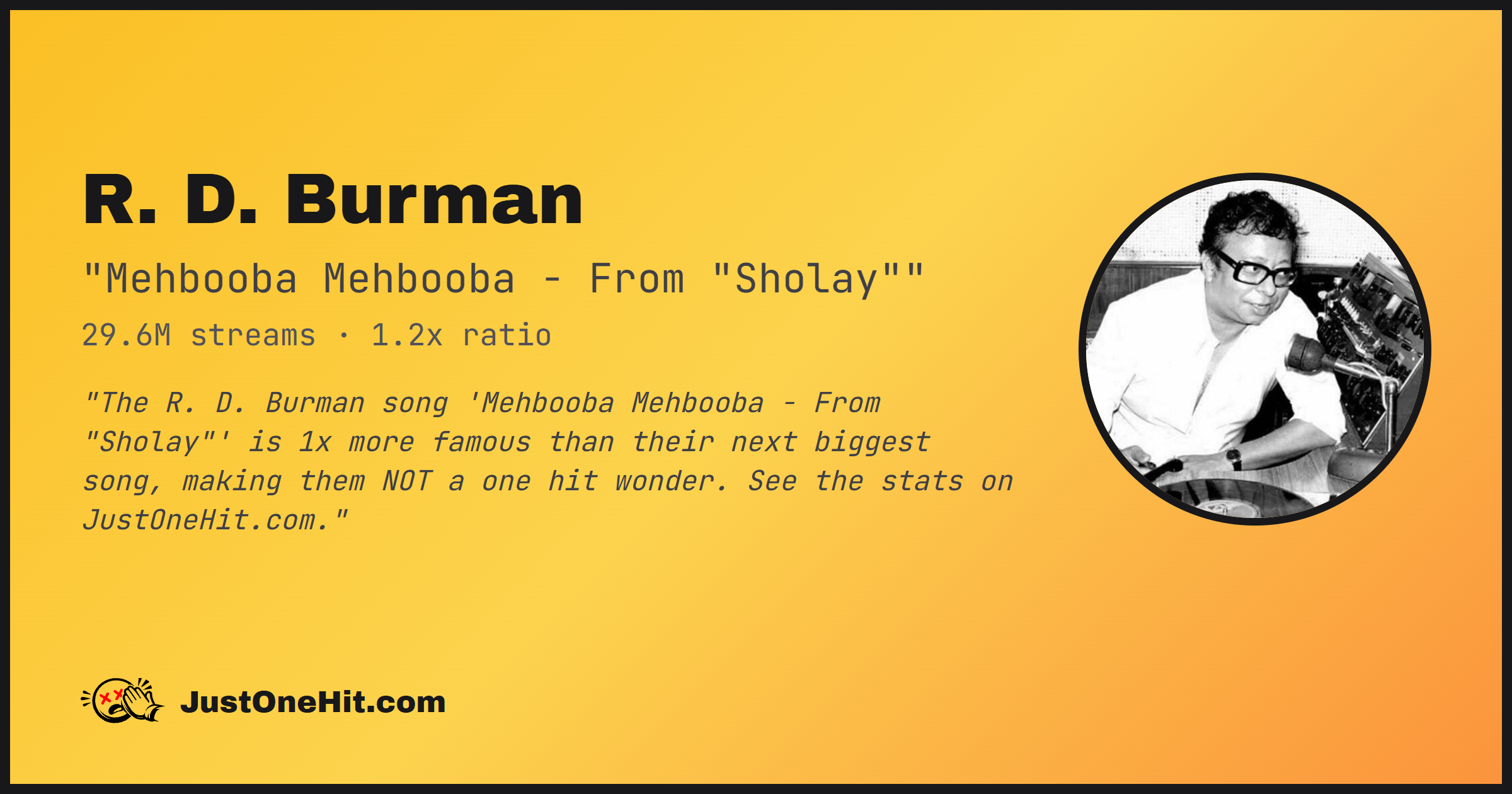 "The R. D. Burman song 'Mehbooba Mehbooba - From "Sholay"' is 1x more famous than their next biggest song, making them NOT a one hit wonder. See the stats on JustOneHit.com."