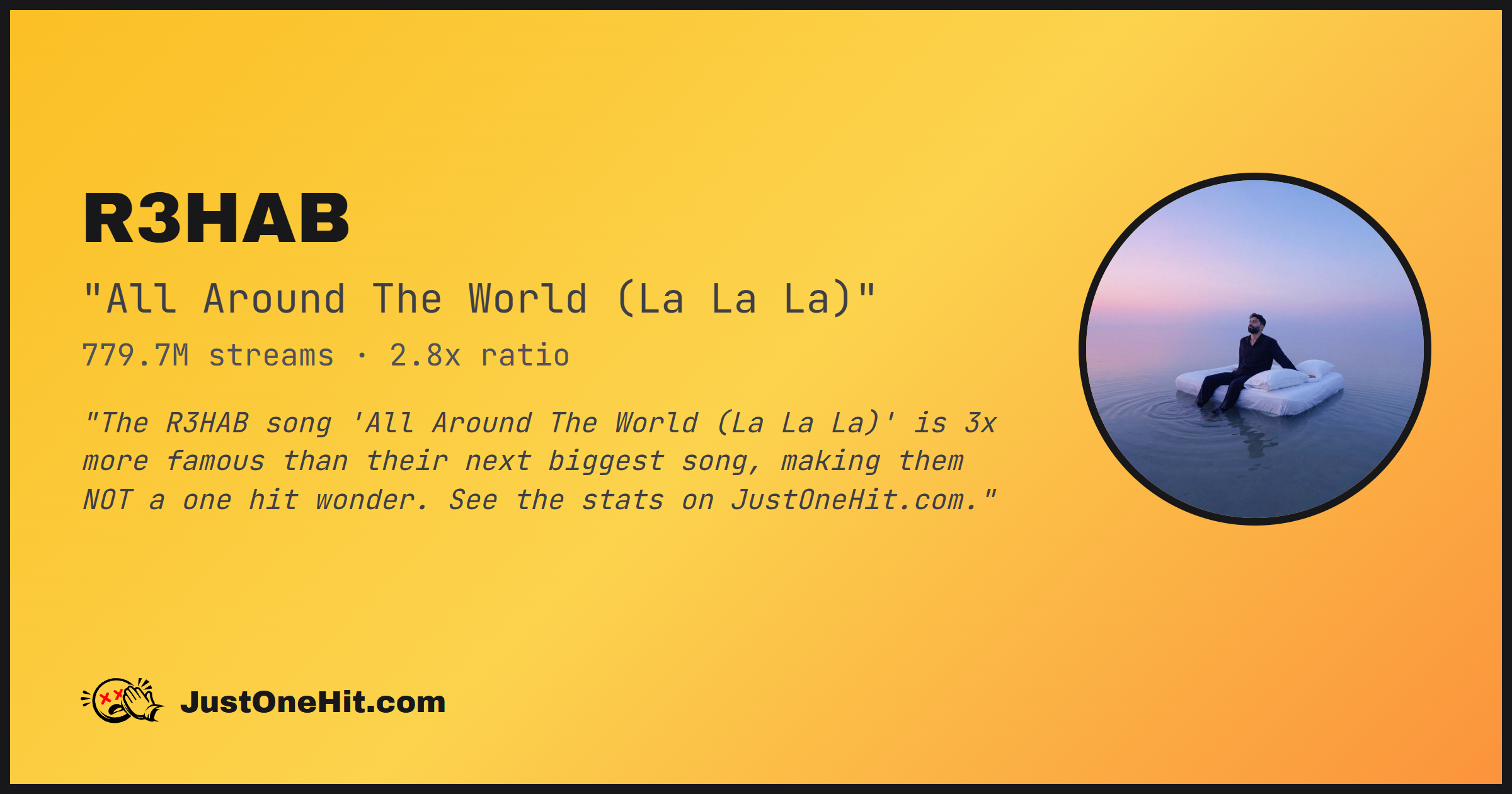 "The R3HAB song 'All Around The World (La La La)' is 3x more famous than their next biggest song, making them NOT a one hit wonder. See the stats on JustOneHit.com."