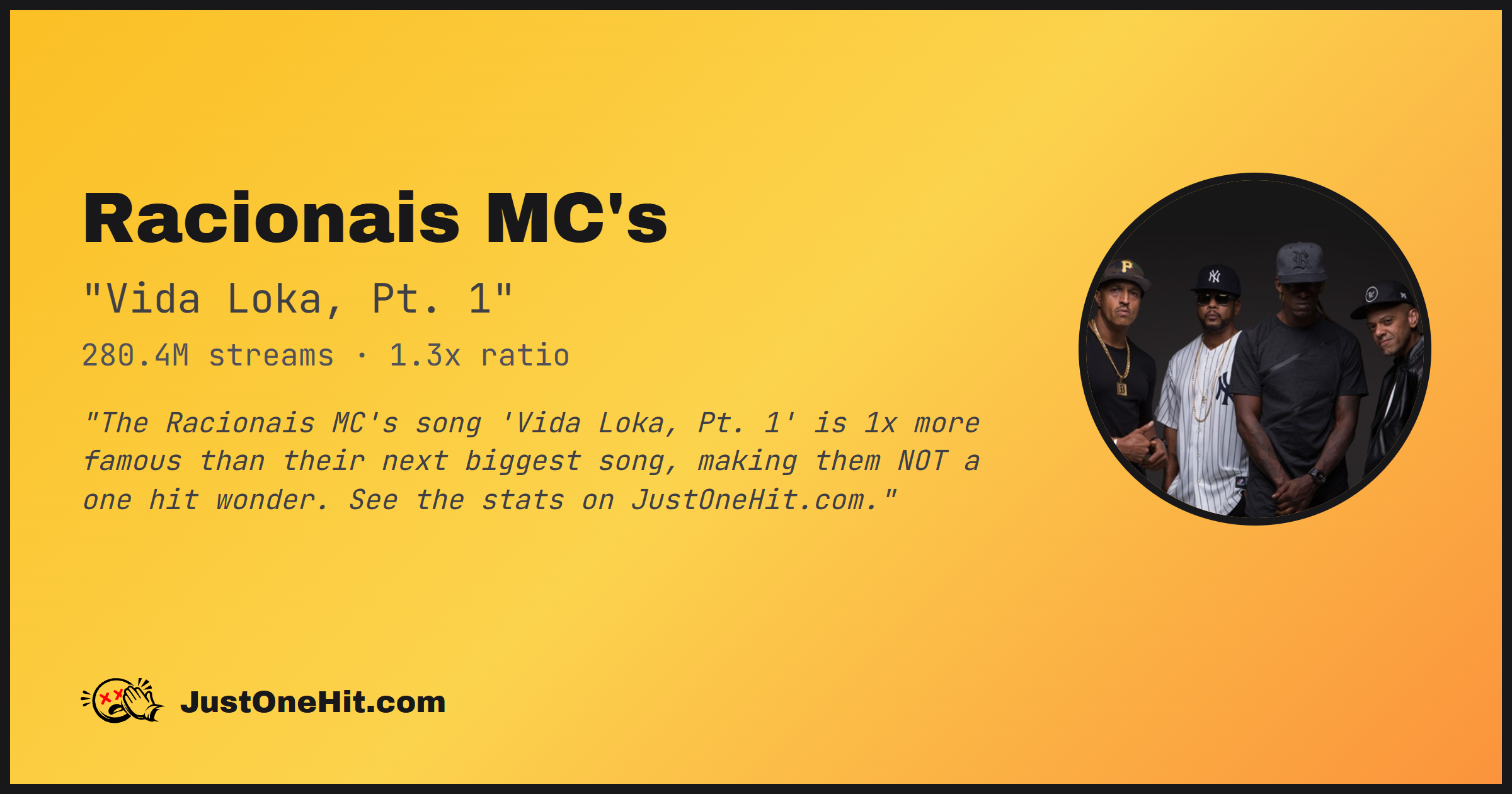 "The Racionais MC's song 'Vida Loka, Pt. 1' is 1x more famous than their next biggest song, making them NOT a one hit wonder. See the stats on JustOneHit.com."