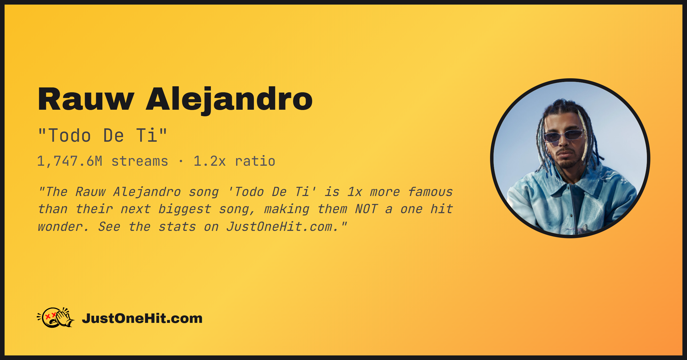 "The Rauw Alejandro song 'Todo De Ti' is 1x more famous than their next biggest song, making them NOT a one hit wonder. See the stats on JustOneHit.com."