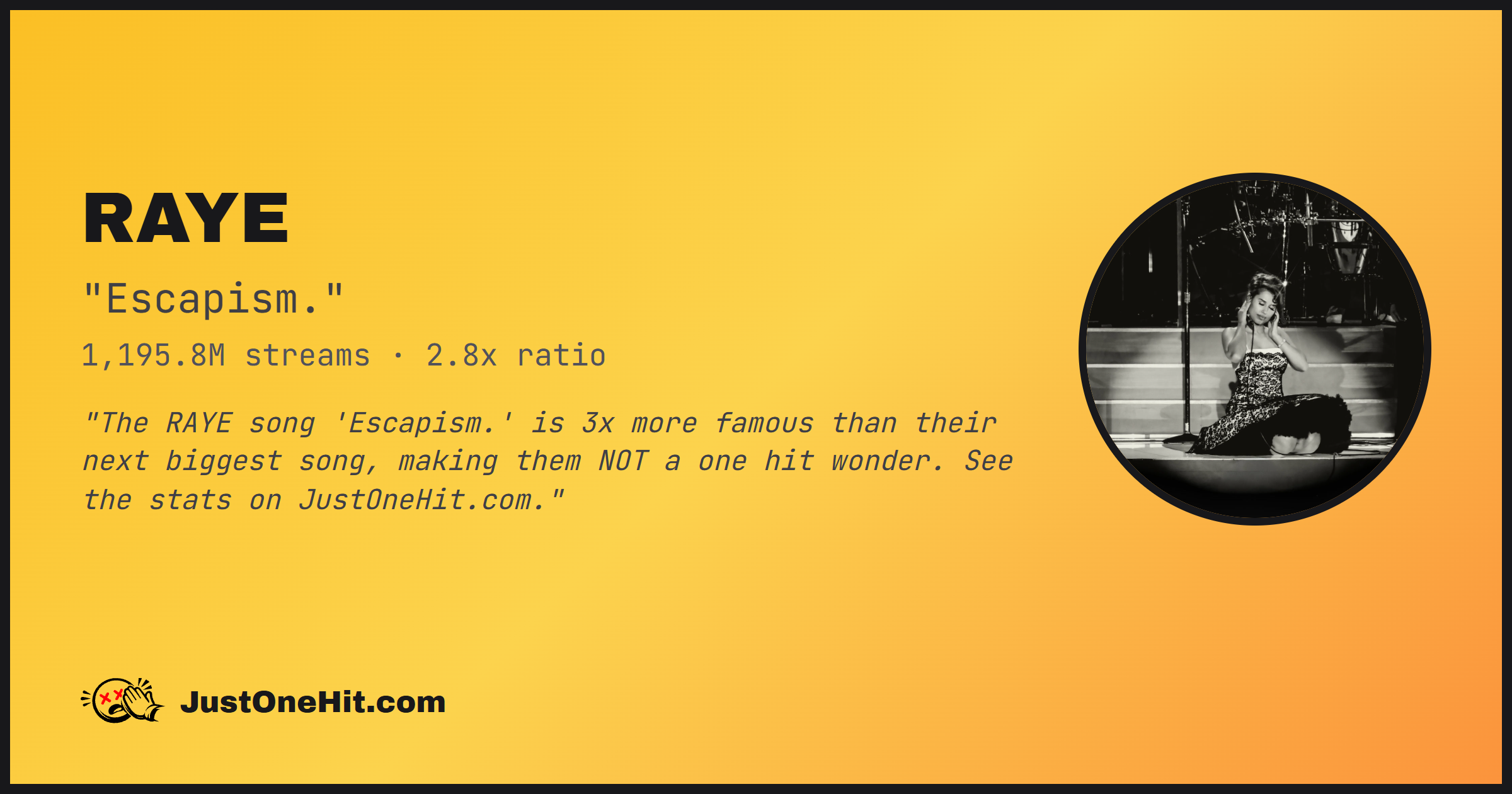 "The RAYE song 'Escapism.' is 2x more famous than their next biggest song, making them NOT a one hit wonder. See the stats on JustOneHit.com."