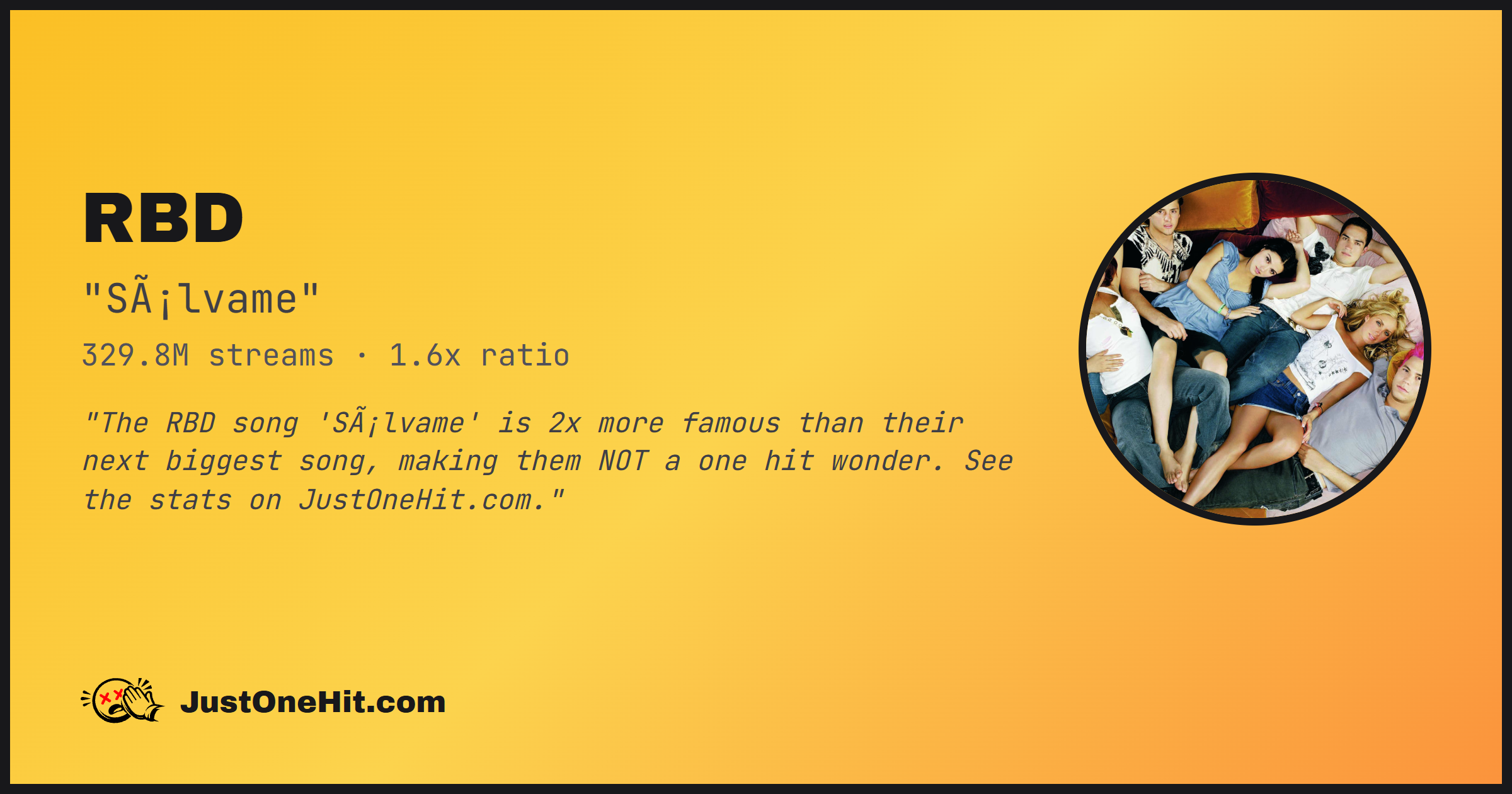 "The RBD song 'Sálvame' is 2x more famous than their next biggest song, making them NOT a one hit wonder. See the stats on JustOneHit.com."
