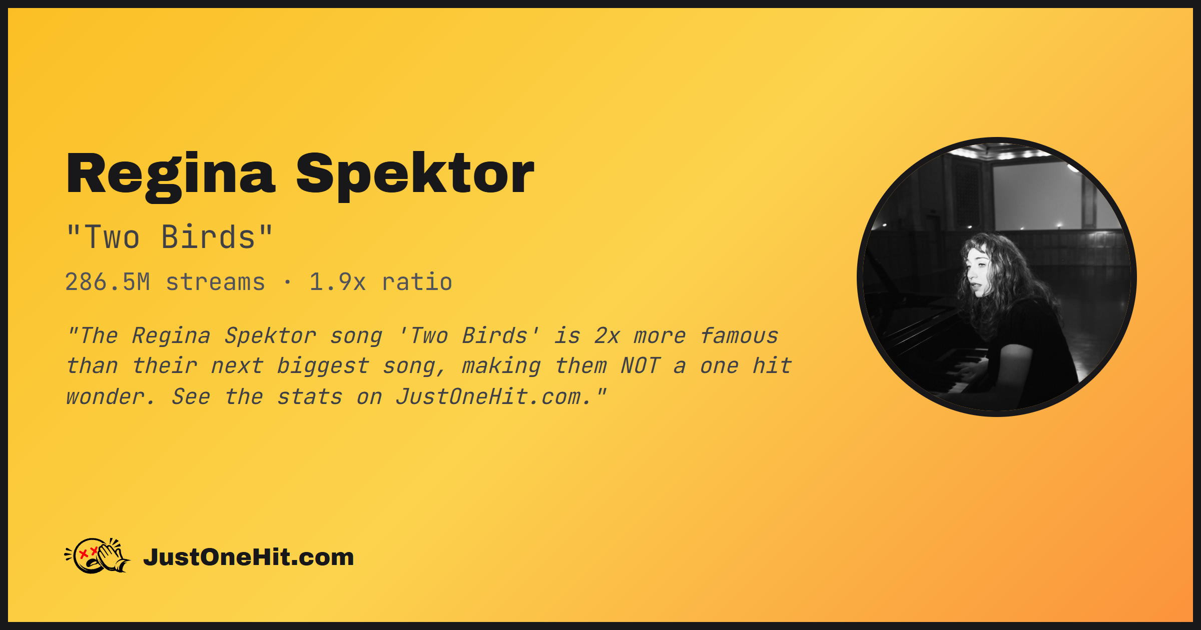 "The Regina Spektor song 'Two Birds' is 2x more famous than their next biggest song, making them NOT a one hit wonder. See the stats on JustOneHit.com."