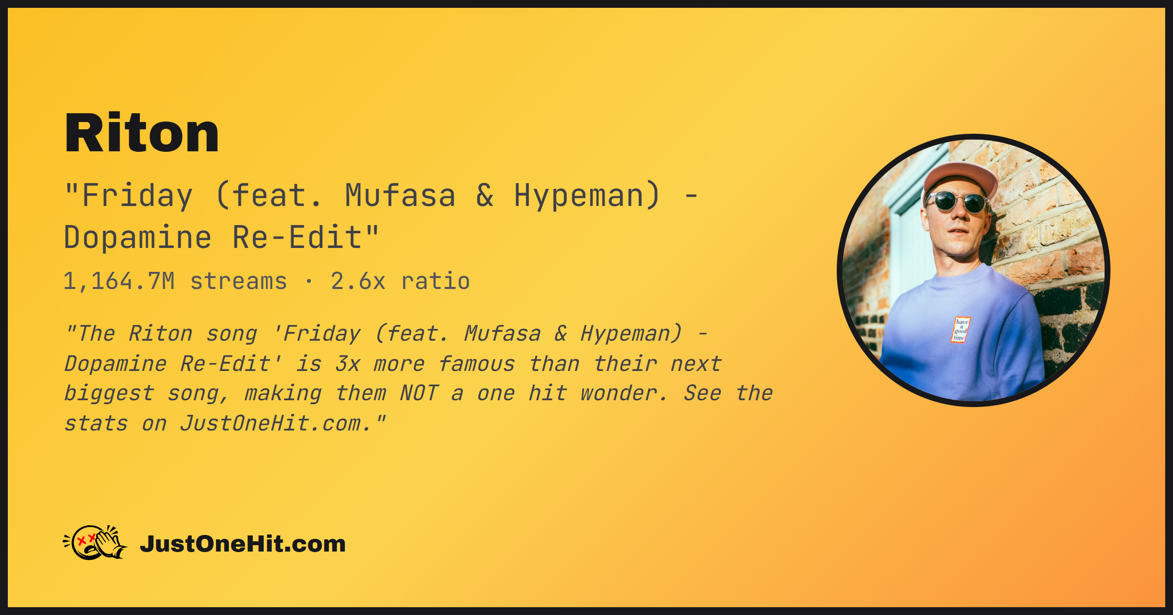 "The Riton song 'Friday (feat. Mufasa & Hypeman) - Dopamine Re-Edit' is 3x more famous than their next biggest song, making them NOT a one hit wonder. See the stats on JustOneHit.com."