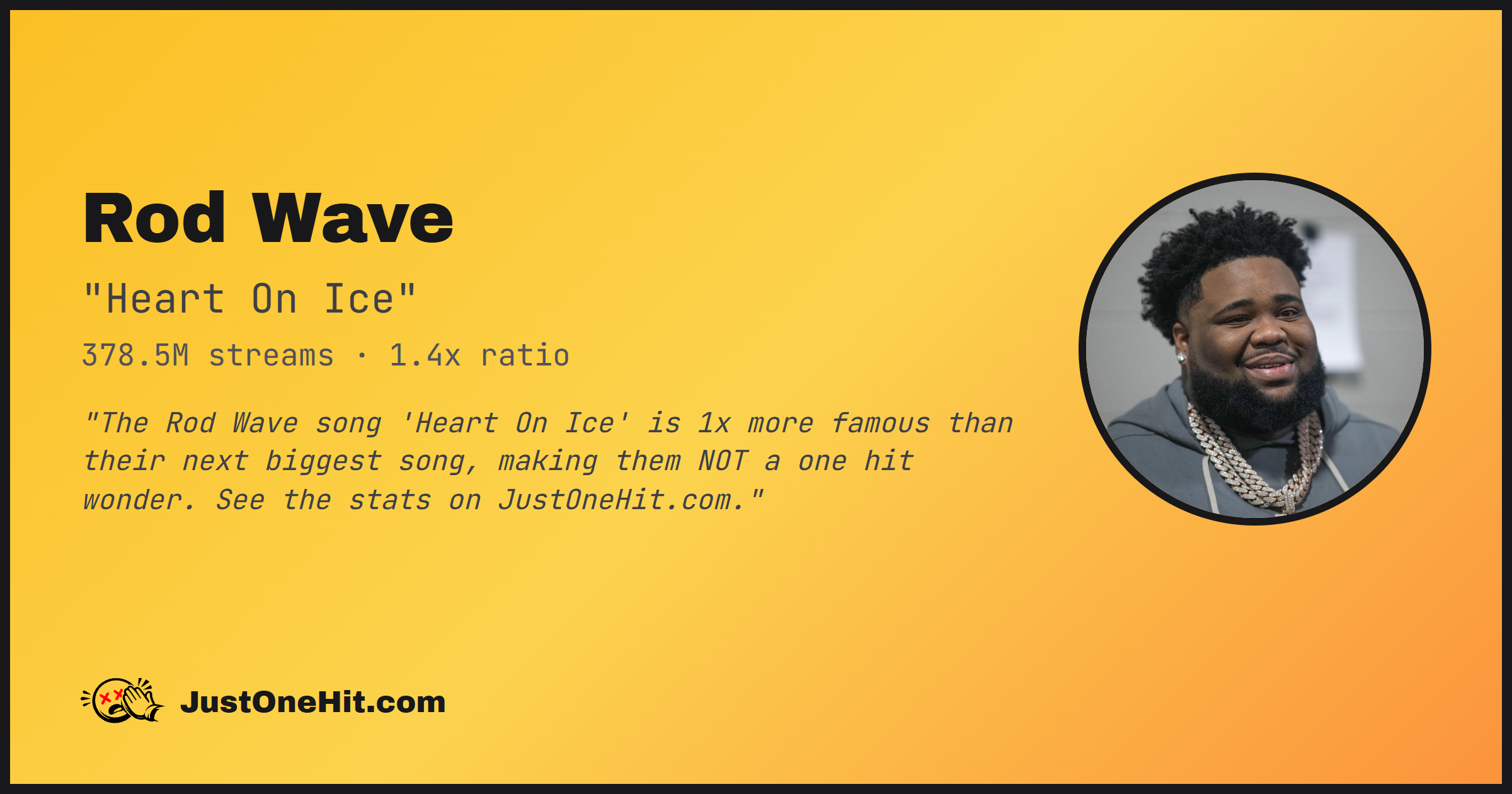 "The Rod Wave song 'Heart On Ice' is 1x more famous than their next biggest song, making them NOT a one hit wonder. See the stats on JustOneHit.com."